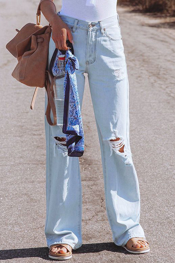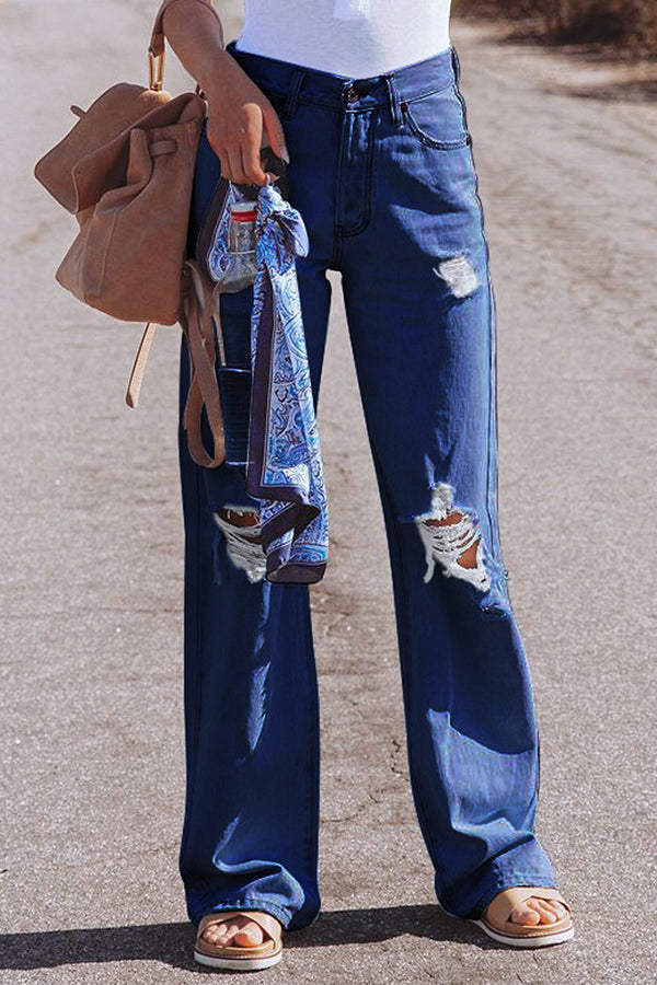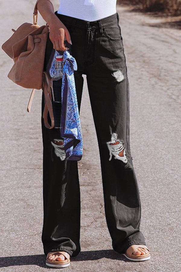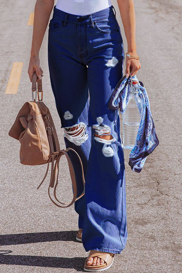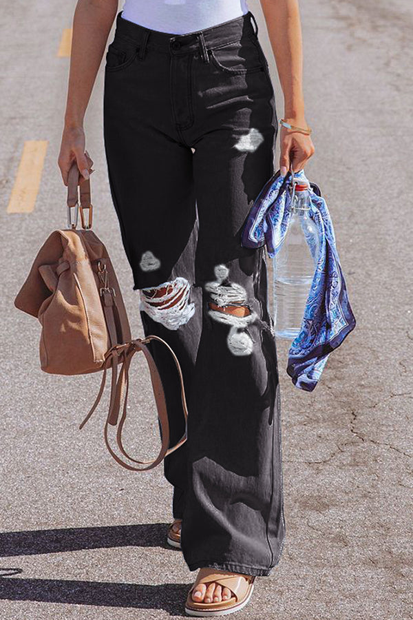 High Waist Denim Pants with Holes Washed