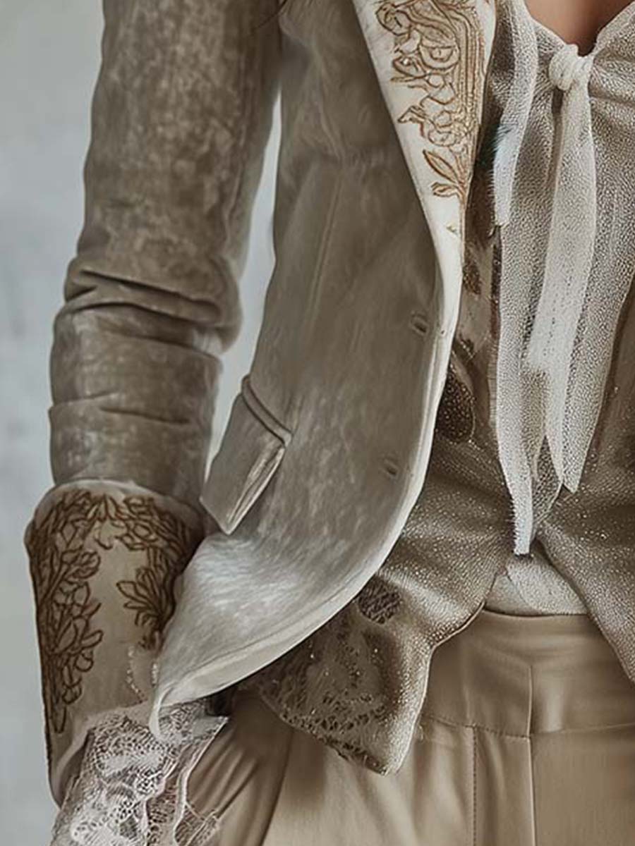 Details: Golden floral embroidery on lapels and cuffs; lace-trimmed cuffs for a romantic finish.