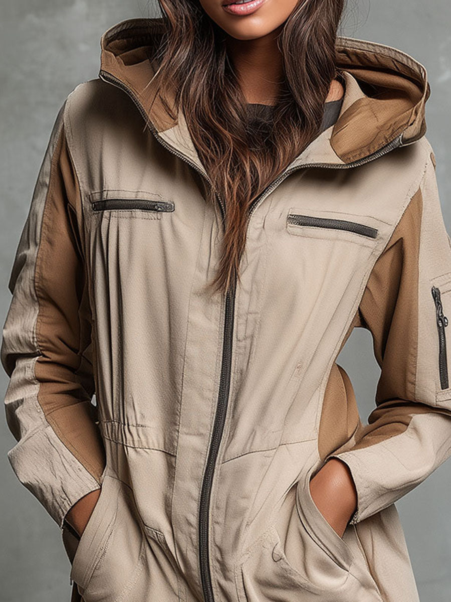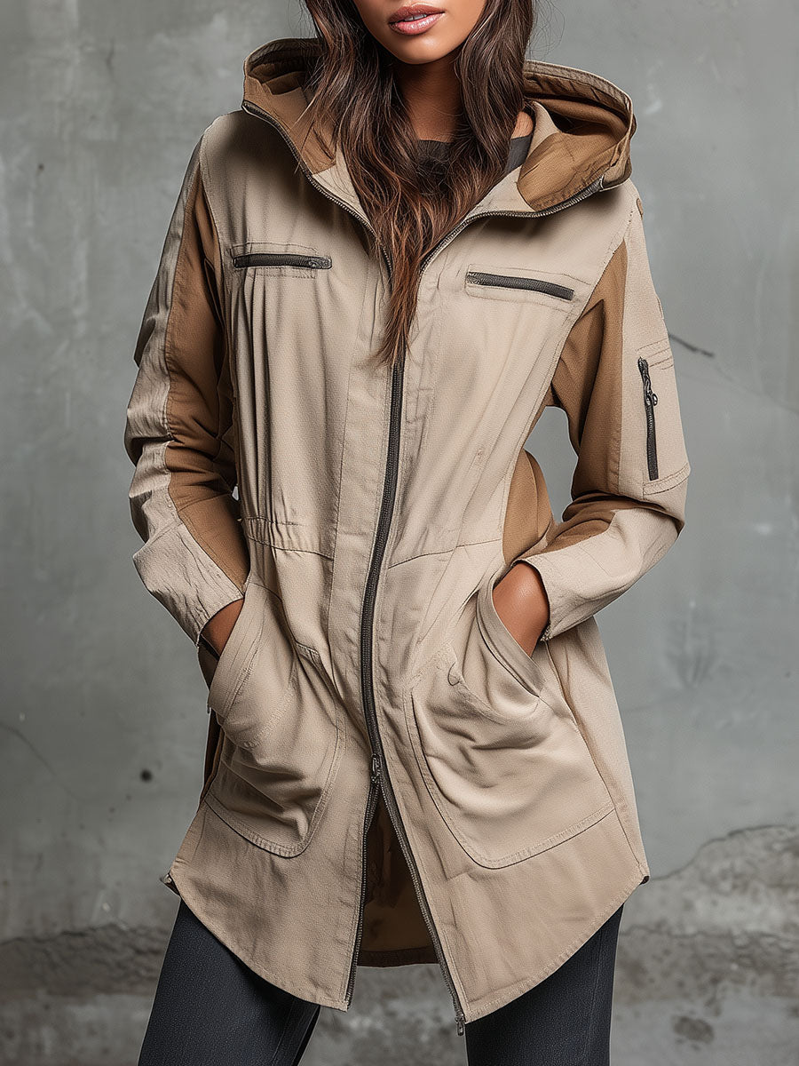 This utilitarian parka jacket pairs effortlessly with both casual and smart-casual outfits. For a laid-back look, layer it over a simple t-shirt or sweater and complete the ensemble with jeans and boots. For a more polished appearance, pair it with tailored pants and leather shoes. The jacket's neutral khaki and brown palette complements a range of colors, making it easy to incorporate into various outfits.