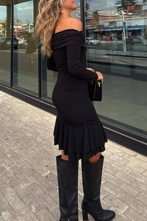 Short stretch dress with a ruffled hem and a bateau neckline. It's quite narrow in the chest and wider at the hips. It can be made shorter or longer.