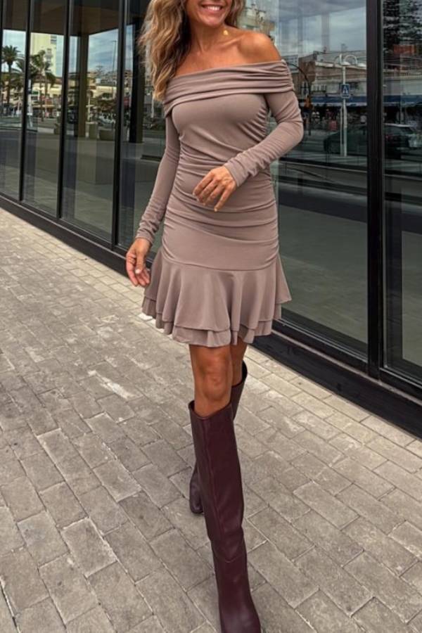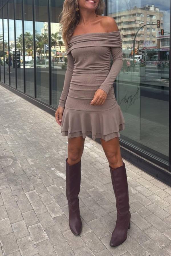 Short stretch dress with a ruffled hem and a bateau neckline. It's quite narrow in the chest and wider at the hips. It can be made shorter or longer.