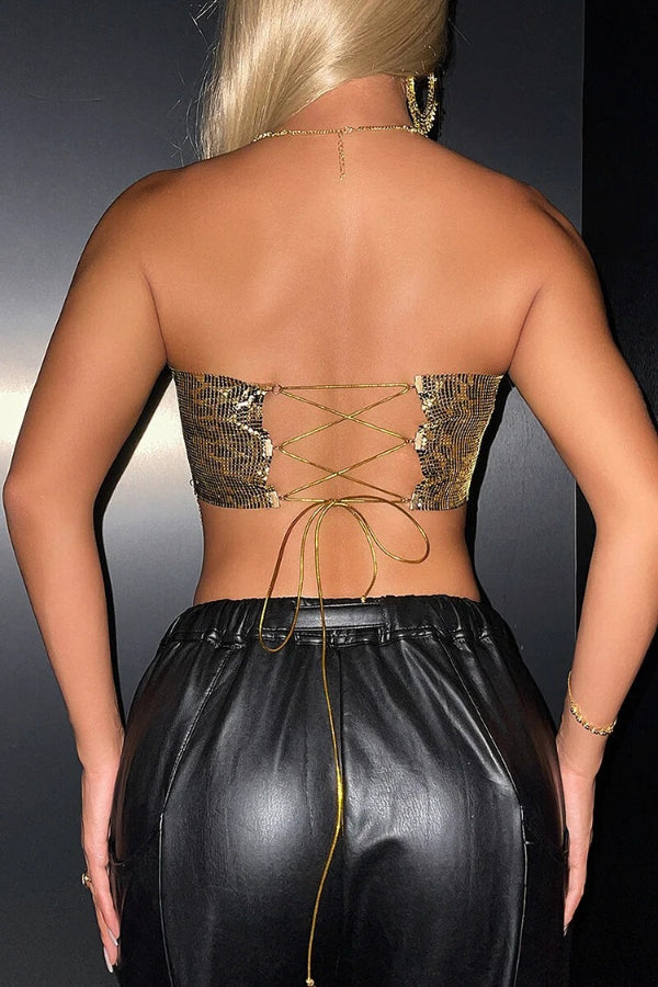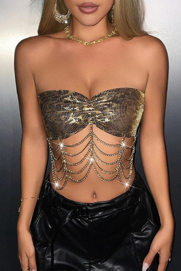 Leopard Pattern Sequin Strapless Layered Chains Decor Party Crop Top-Gold