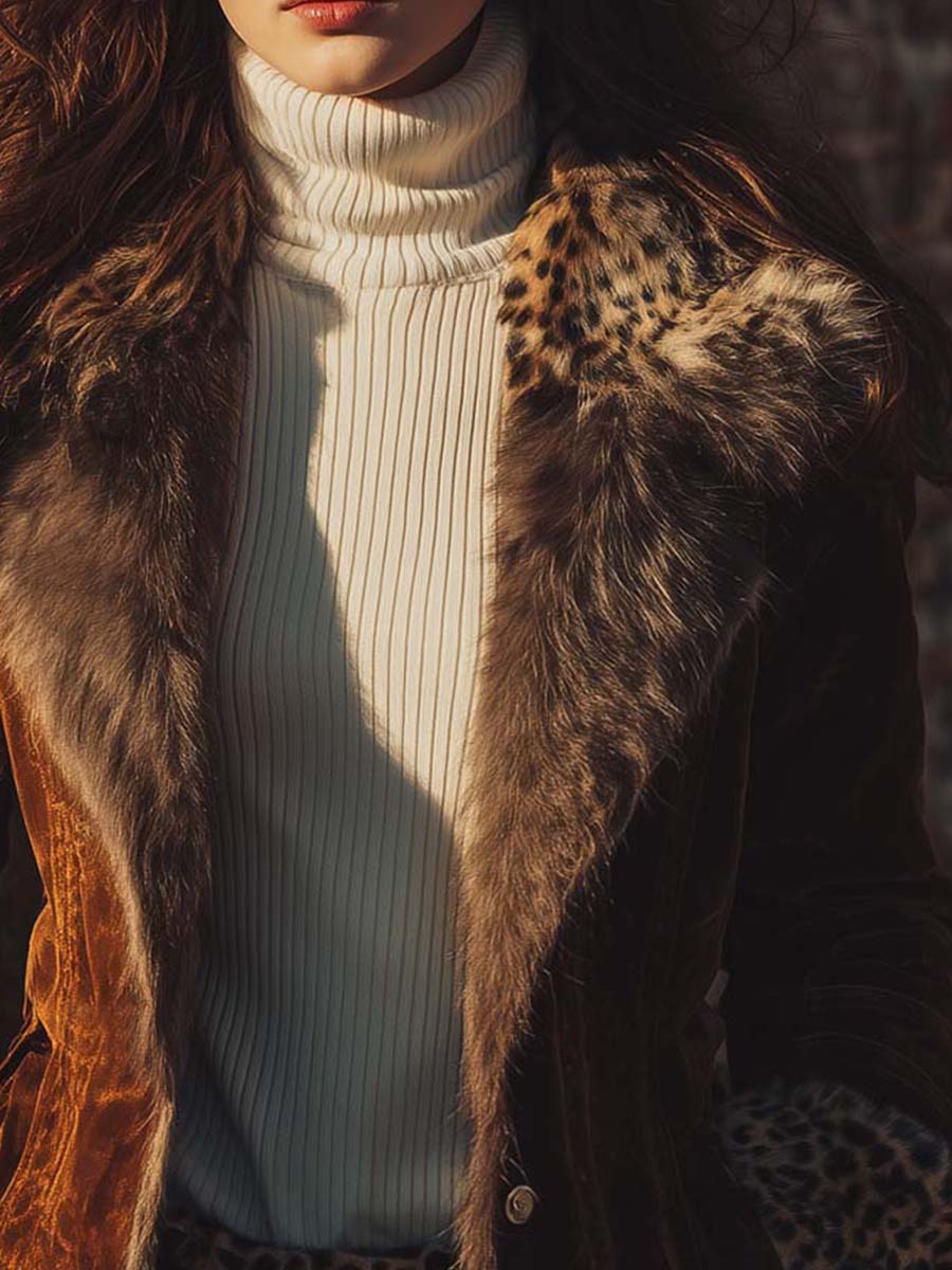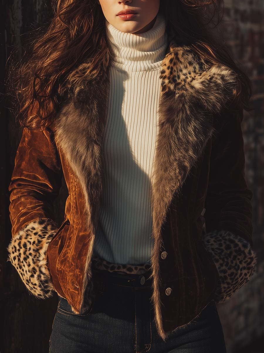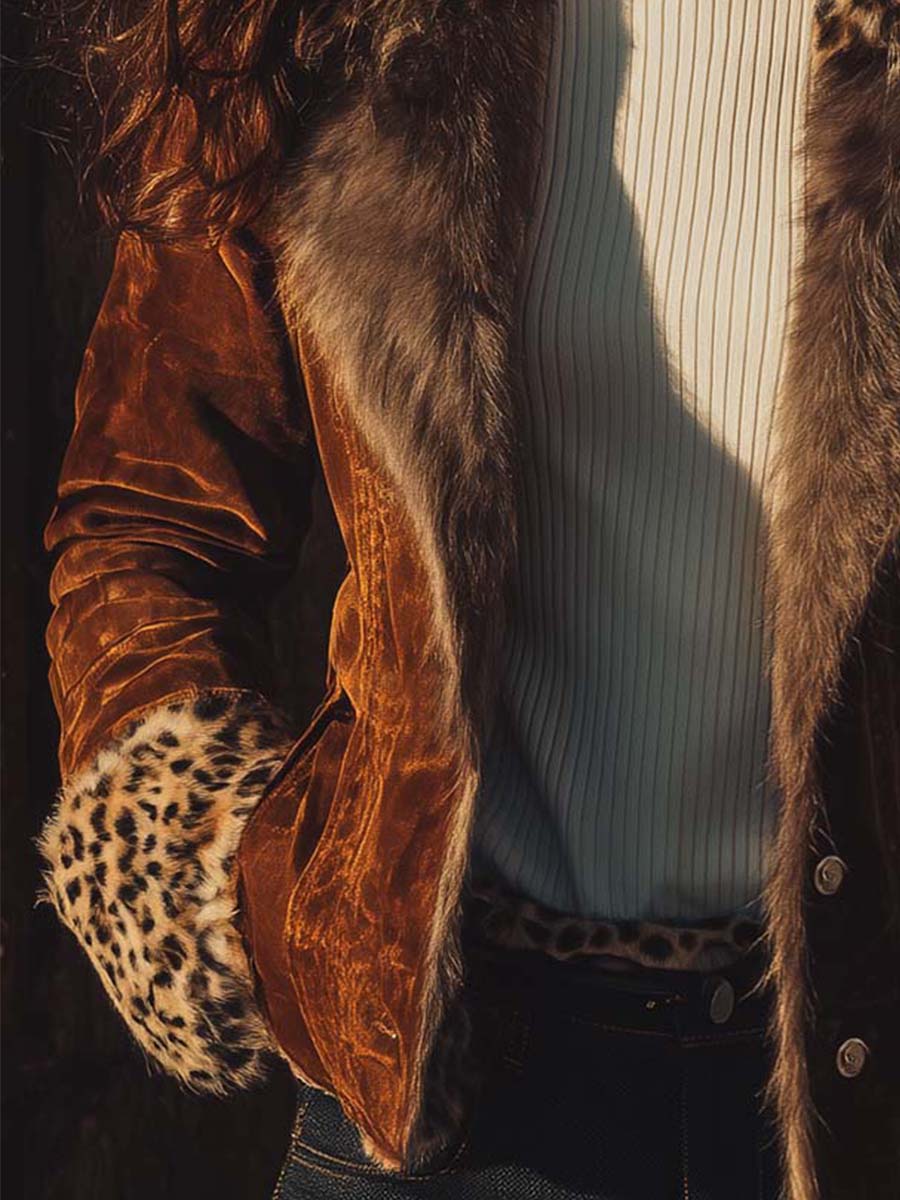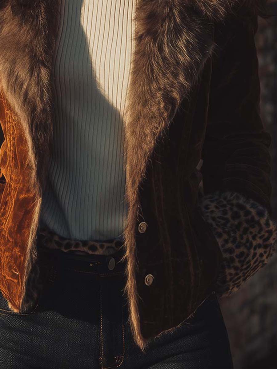 A modern interpretation of vintage allure, this Leopard Trim Jacket is crafted from eco-friendly faux suede, offering the supple hand feel of genuine suede with sustainable sensibility. The Amber Brown tone captures the warmth of autumn light, while the leopard-pattern faux-fur collar and cuffs infuse a subtle wild edge. Tailored with clean lines and soft structure, this jacket bridges the spirit of retro bohemian luxury and modern quiet confidence.