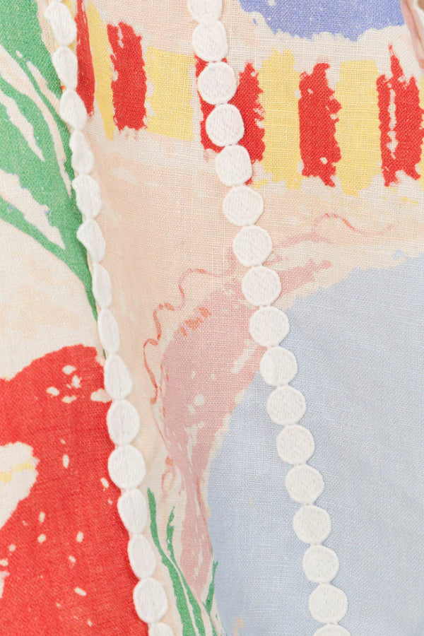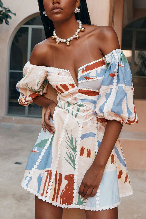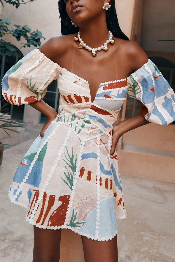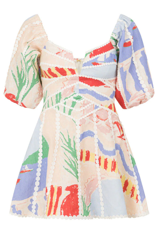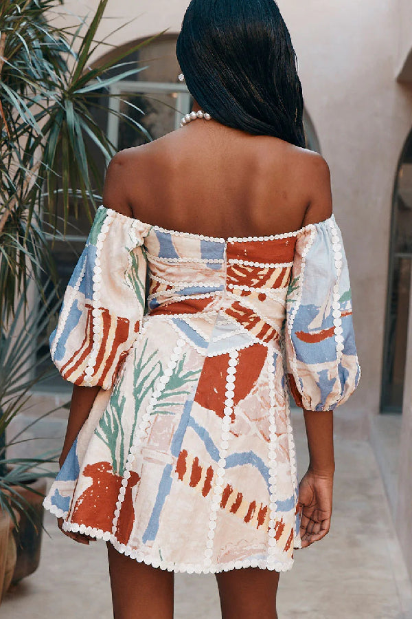 Linen Blend Trims Unique Print Puff Sleeve Mini Dressc