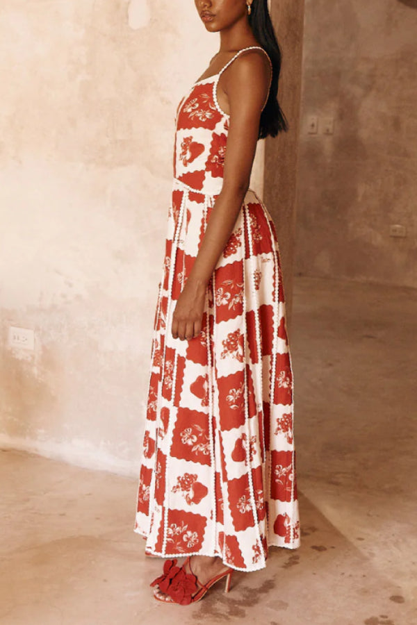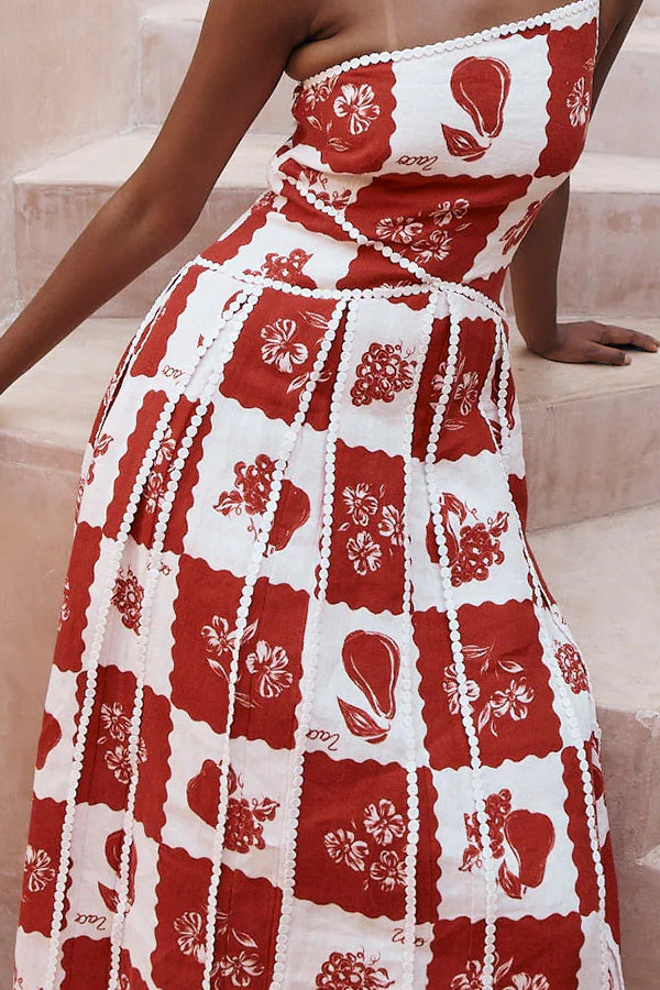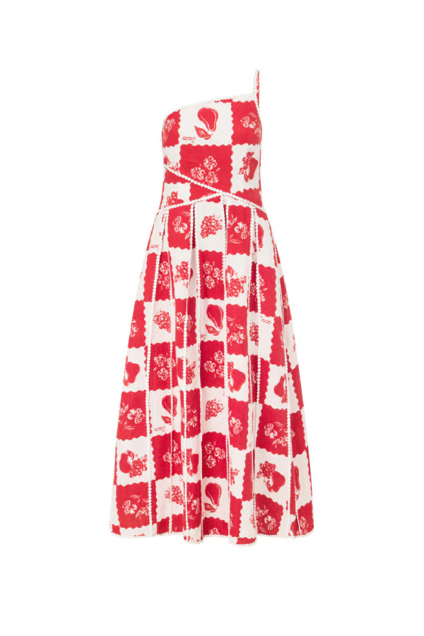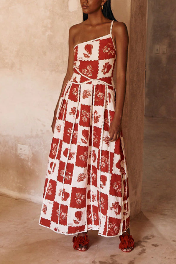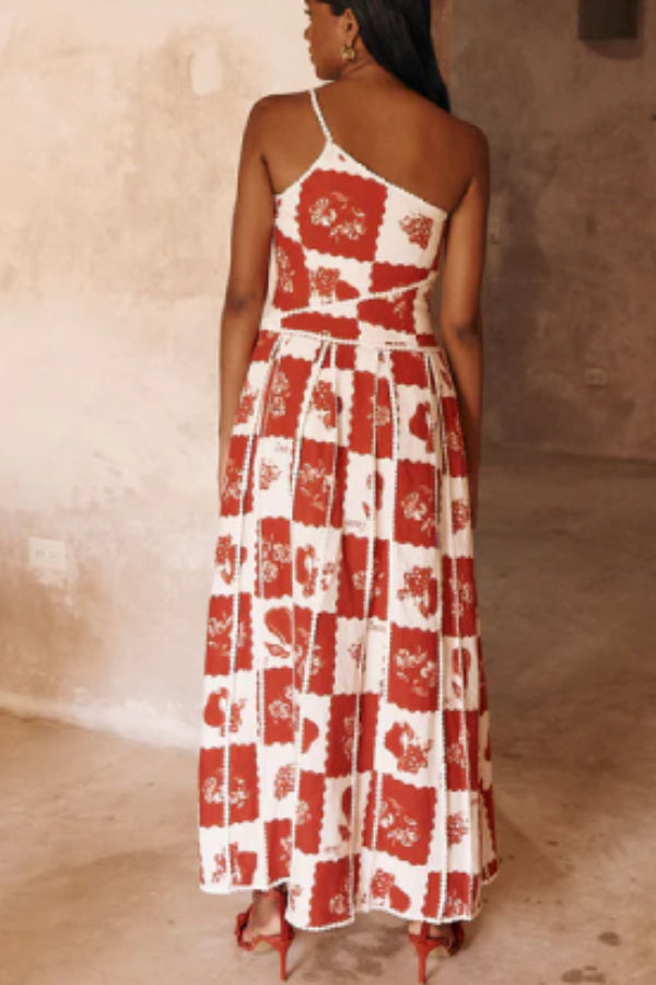 Linen Blend Unique Print One Shoulder Flared Maxi Dress
