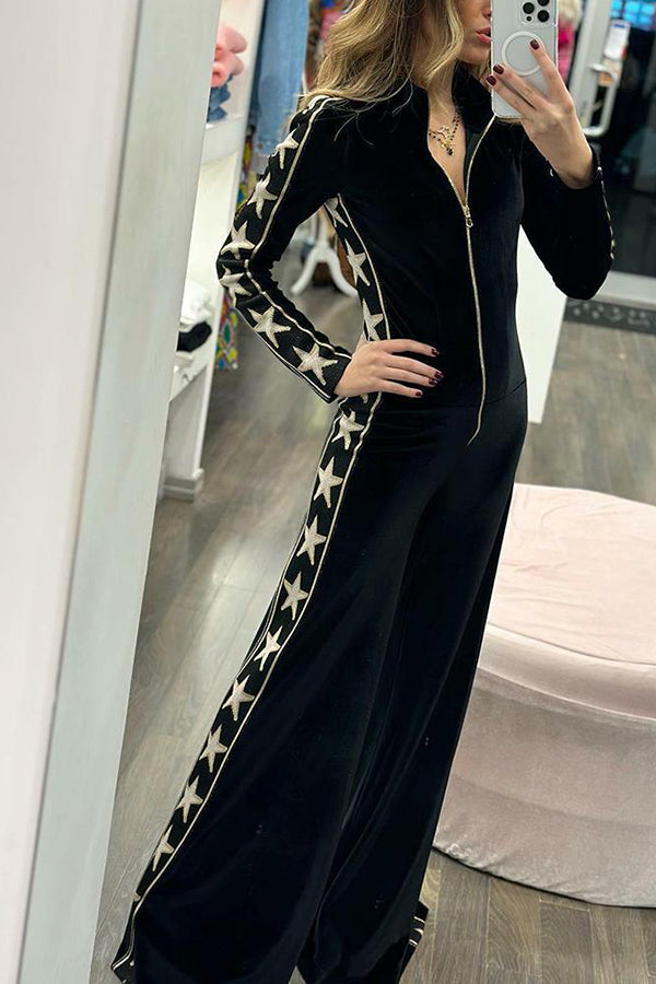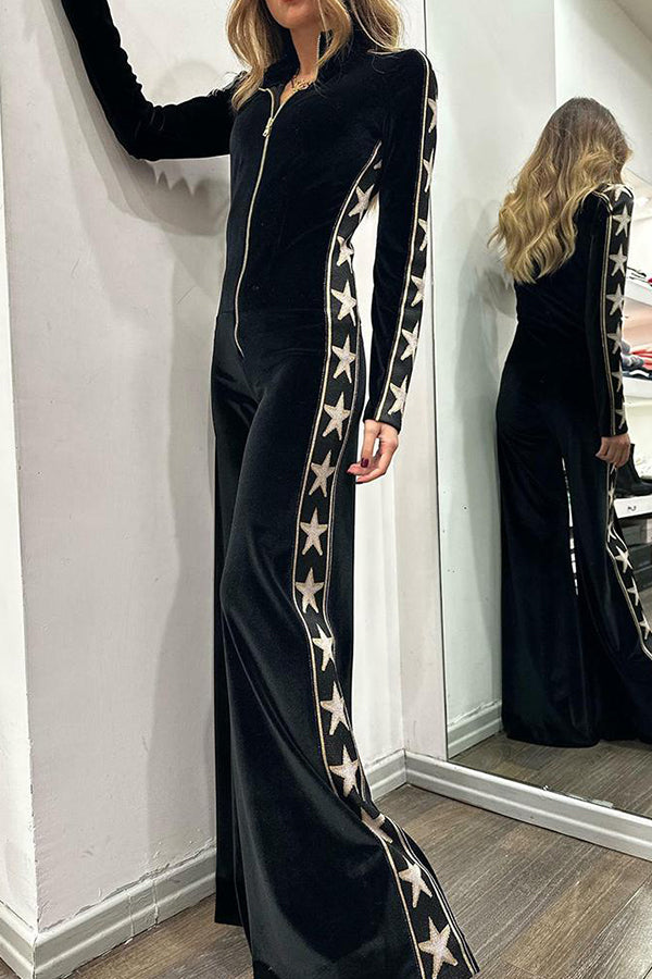 Long-sleeved velvet jumpsuit with zipper