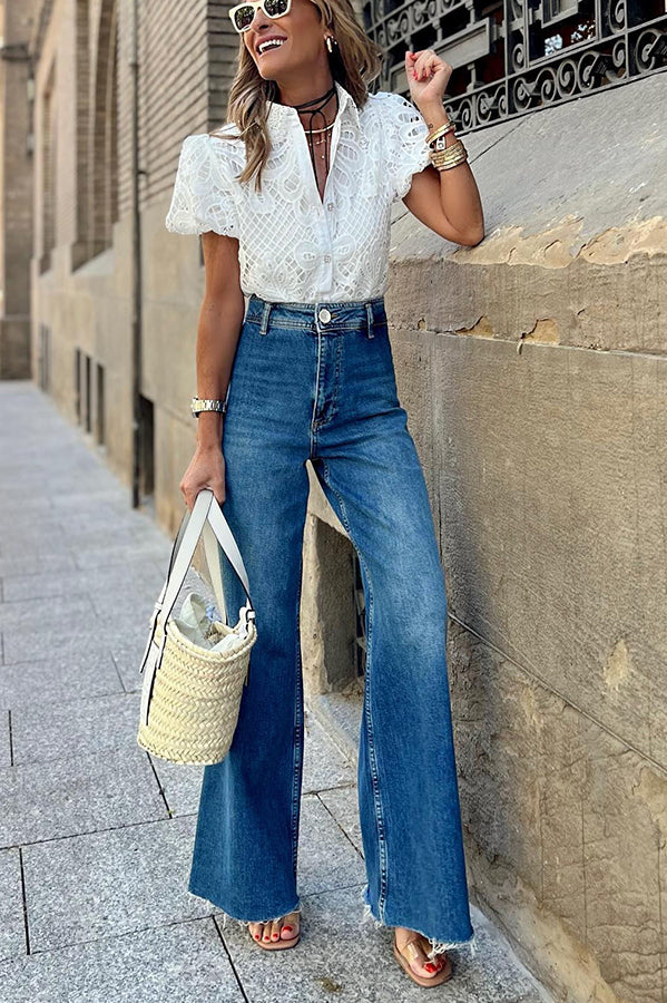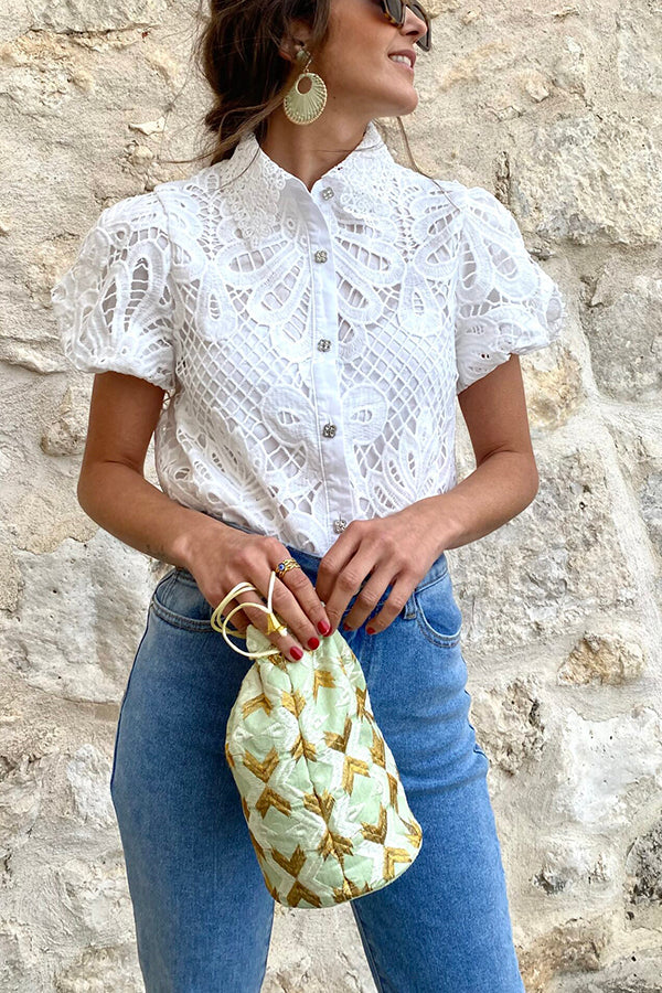 Lush and Lovely Crochet Lace Puff Sleeves Button Up Blouse
