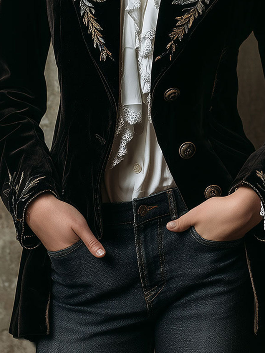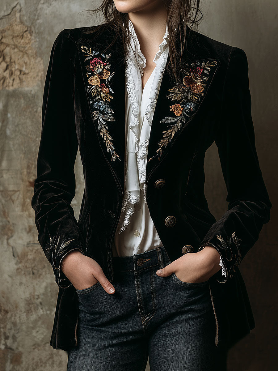 Luxurious Vintage Floral Embroidered Velvet Tailored Blazer