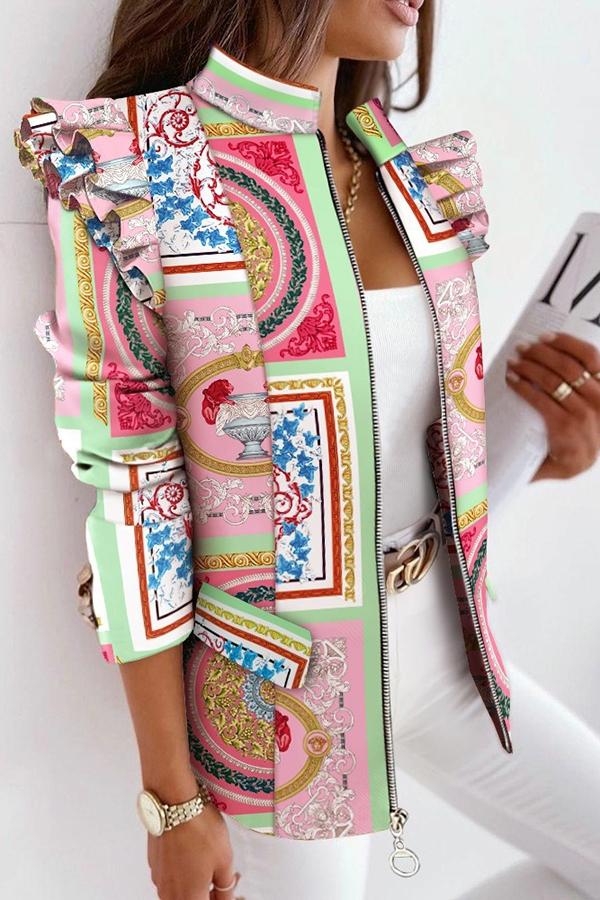 Melrose Plaid Print Ruffles Sleeve Zipper Up Coat