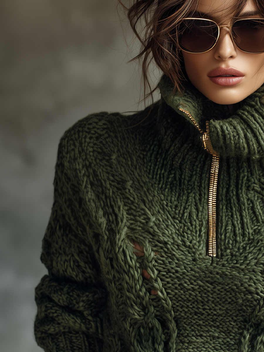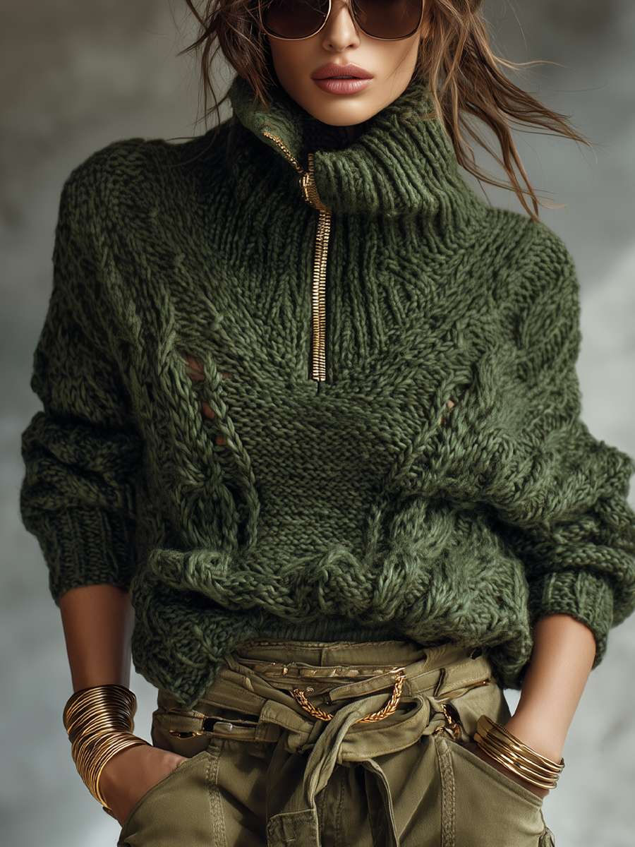 The Metal Zip-up Collar Cable-knit Sweater is a must-have for fashion enthusiasts who appreciate the blend of classic design and modern touches. Whether you’re dressing up or down, this sweater offers endless styling possibilities while keeping you warm and stylish throughout the season.
