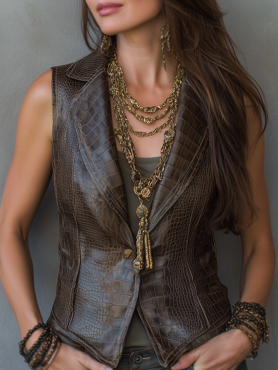 The Metallic and Vintage Crocodile-Effect Vest is an essential addition for any fashion-forward wardrobe. Its unique texture and modern metallic finish offer a bold yet elegant option for those looking to make a statement. Whether worn in a casual or formal setting, this vest guarantees to capture attention and admiration.