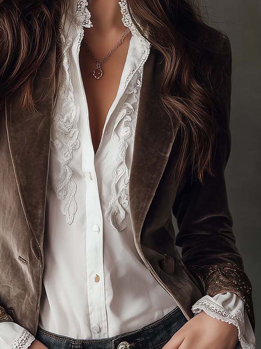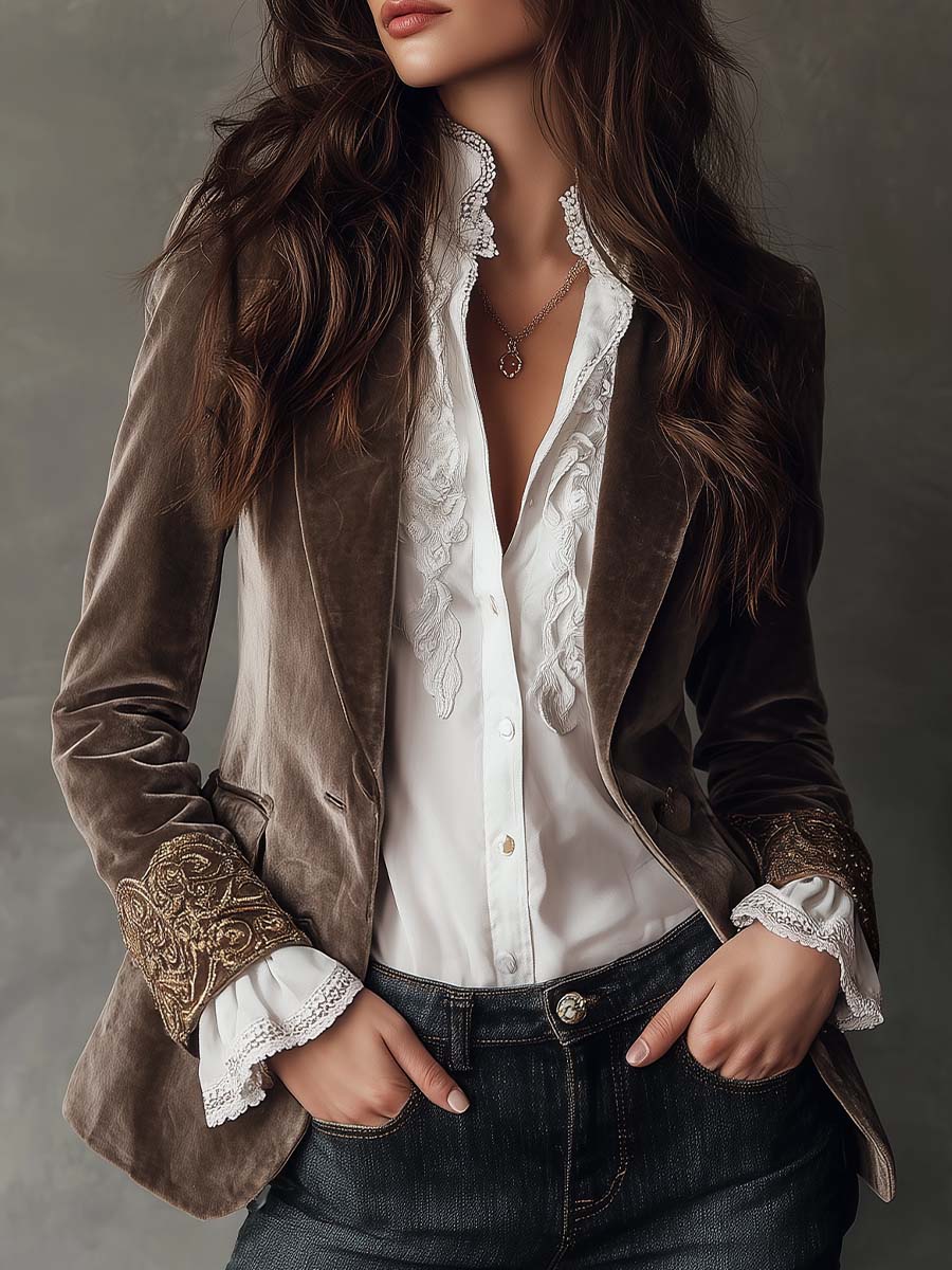 This velvet embroidered blazer channels refined bohemian luxury through intricate details and timeless tailoring. Crafted from smooth polyester velvet, it features ornate golden embroidery on the cuffs, accentuating the structured silhouette with a hint of vintage opulence. The Mink Taupe hue offers understated elegance — soft, neutral, and endlessly versatile. Perfect for both day refinement and evening sophistication.