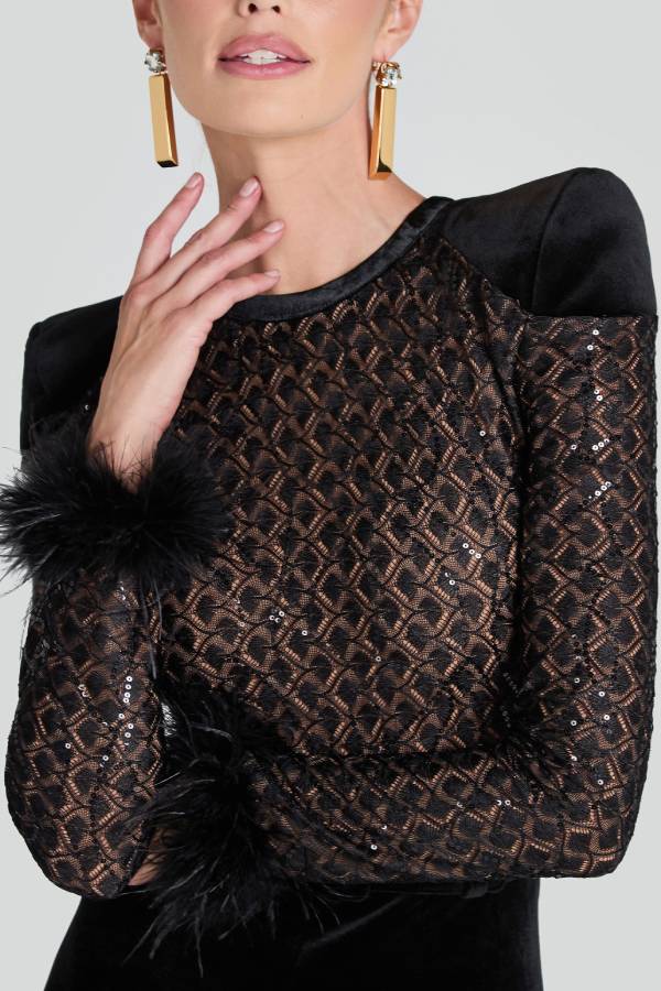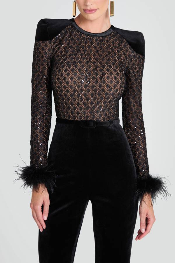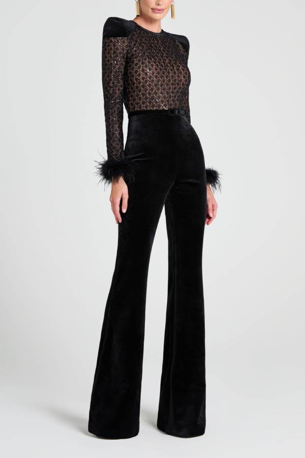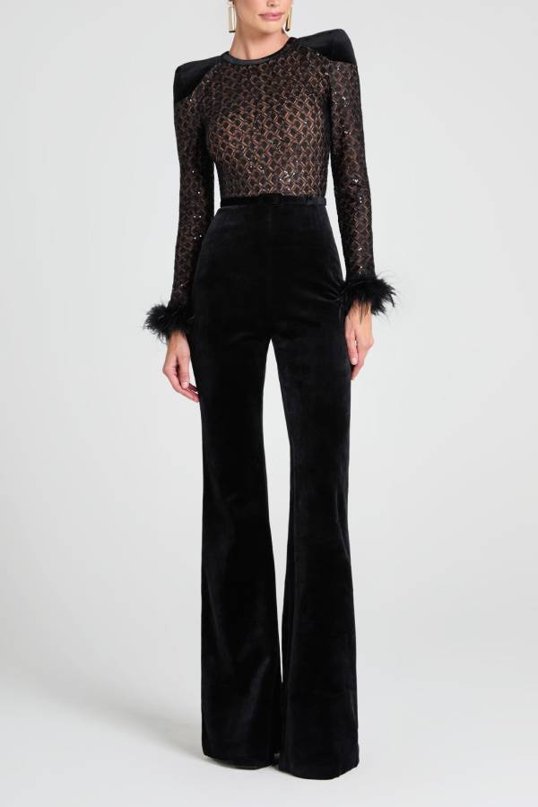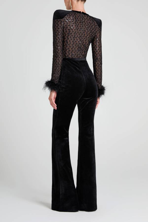 Monique Fish Scale Lace Sequin Velvet Patchwork Feather Trim Stretch Flare Jumpsuit