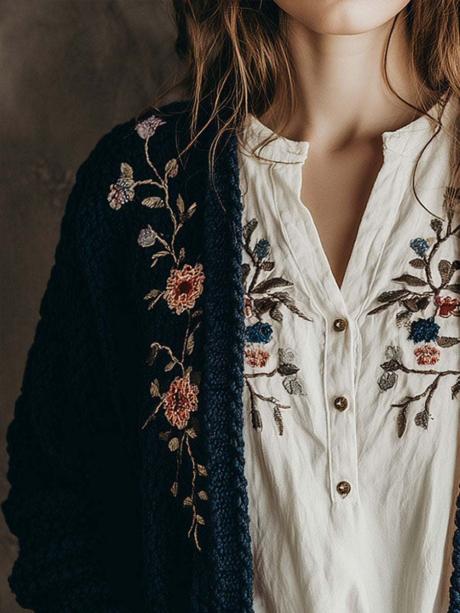 This cardigan can be effortlessly paired with a plain white tee and jeans for a casual look, or layered over a dress for a more sophisticated ensemble. Pair it with ankle boots and simple accessories to keep the focus on the intricate embroidery.