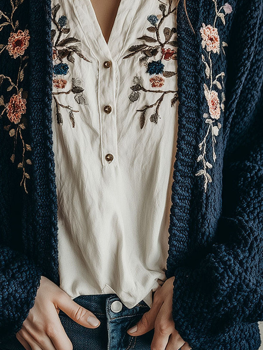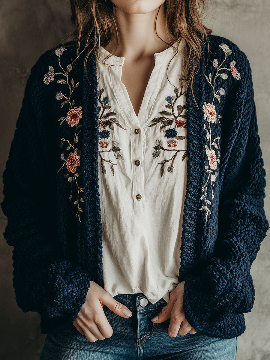 Navy Blue Chunky Knit Cardigan With Floral Embroidery