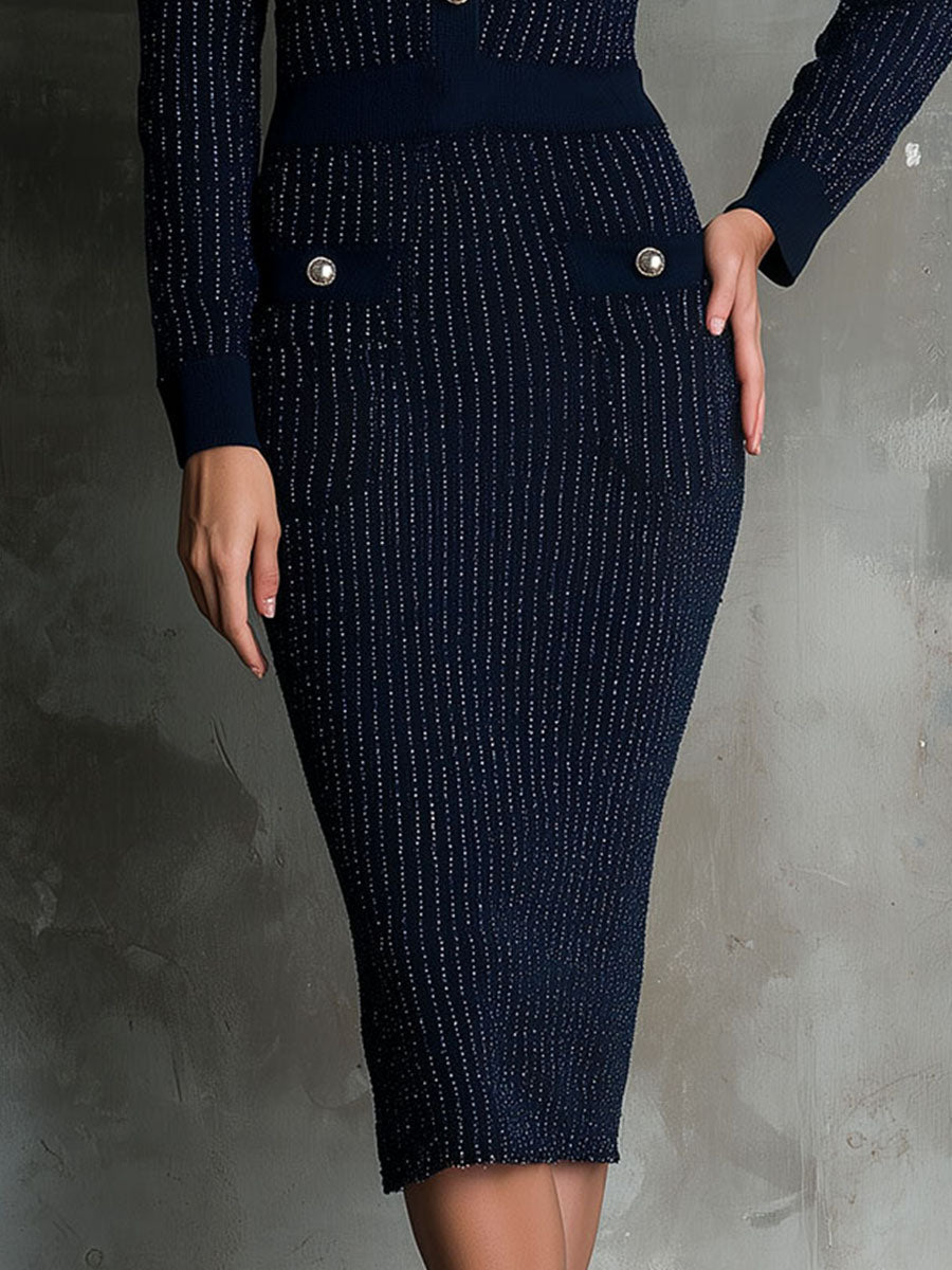 Navy Blue Luxe Knit Bodycon Dress With Shimmering Stripes
