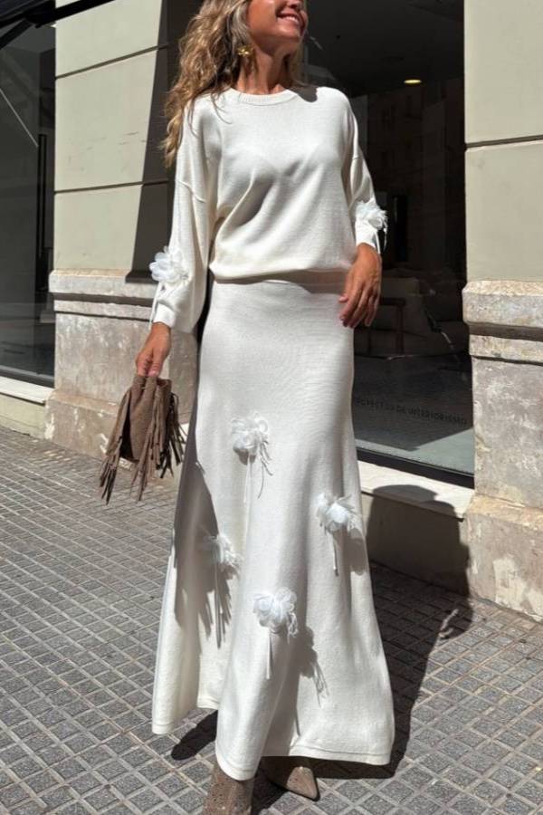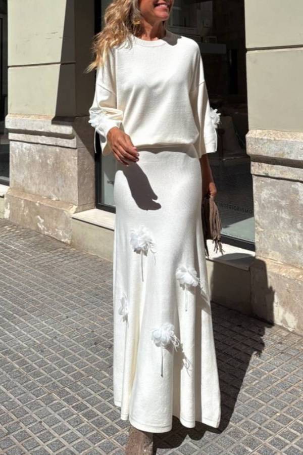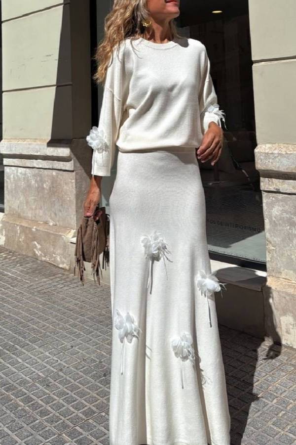 Jersey + skirt set with organza and feather flower details