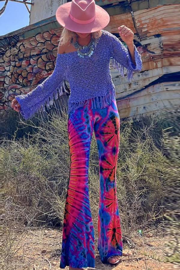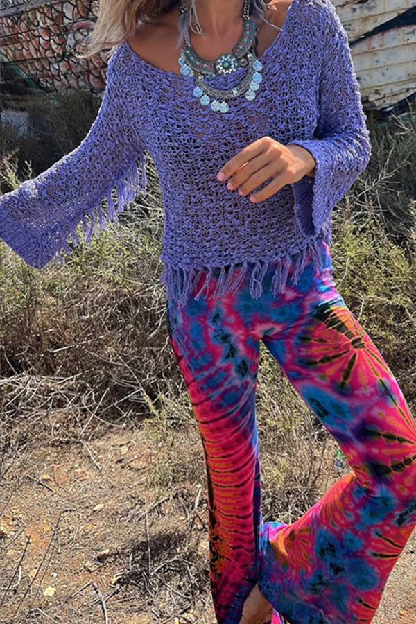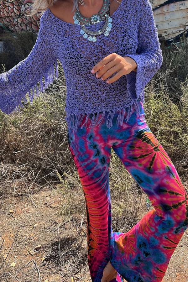 This loose-fitting top is crafted from knitted fabric, featuring an openwork texture, flared sleeves, and tassel embellishments at the hem. The knitted material is breathable and skin-friendly, the openwork design enhances a relaxed and casual feel, and the tassel elements add a touch of vintage charm. Suitable for vacations and everyday casual wear, it can be paired with various bottoms to create a "effortlessly chic and comfortable" look, making it a core piece that combines style and comfort.