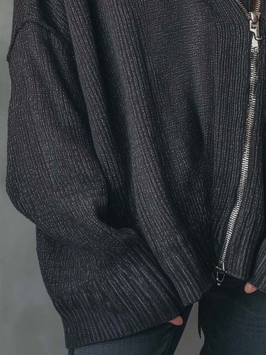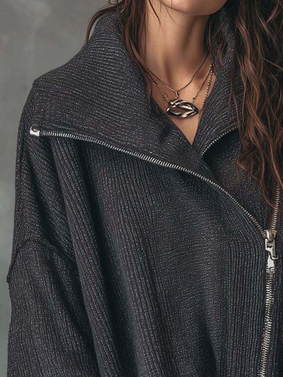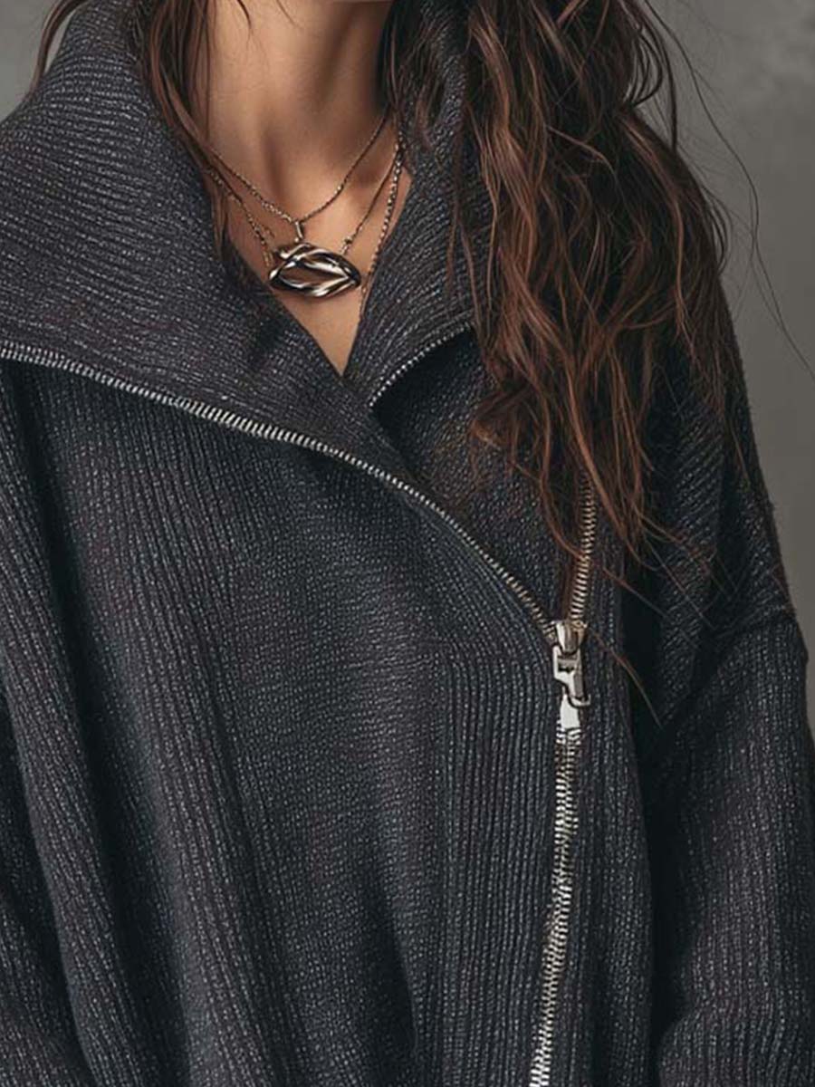 A contemporary take on casual comfort, this oversized knit top features a soft ribbed texture and an edgy asymmetrical front zipper. Designed with a relaxed silhouette and wide sleeves, it strikes the perfect balance between cozy layering and modern streetwear style. The subtle sheen of the fabric adds depth, making it versatile for both daytime wear and evening layering.