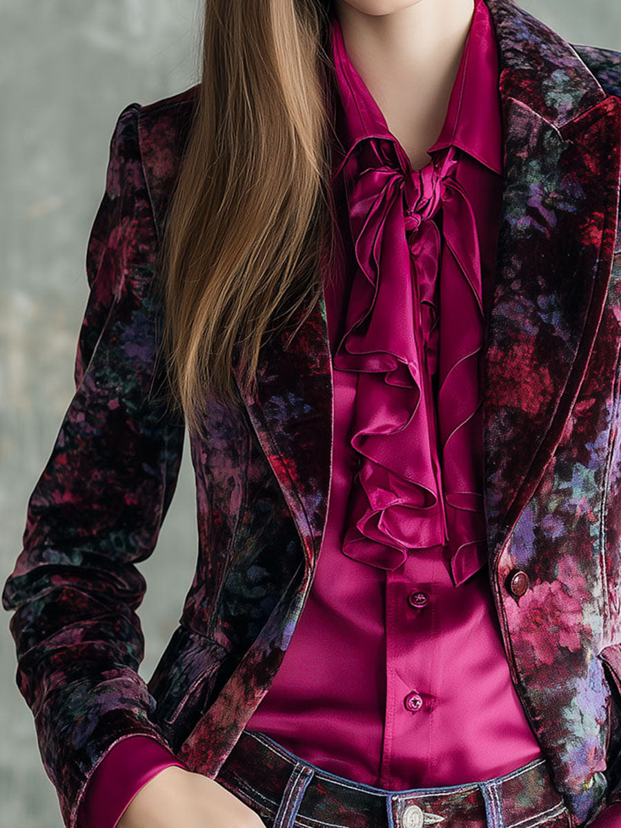 Painterly Print & Notched Lapels Purple Velvet Blazer