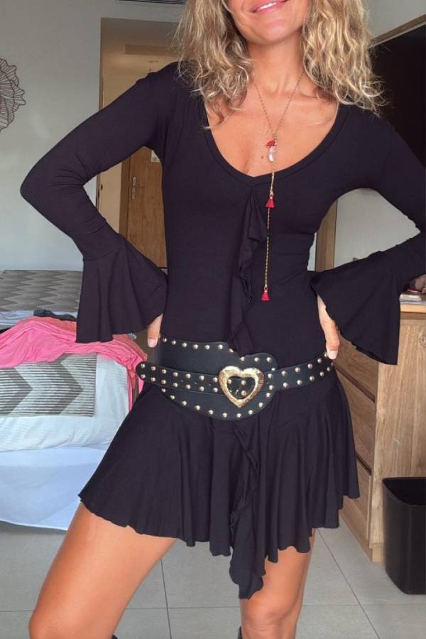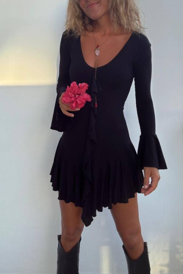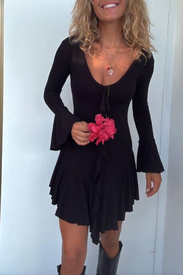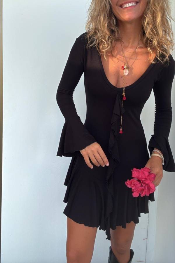 Short stretch dress, long sleeves with ruffles and skirt finished with a ruffle