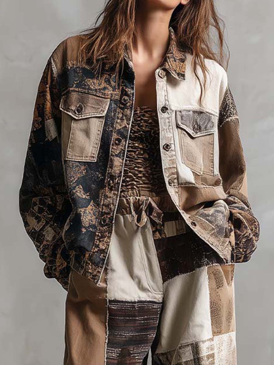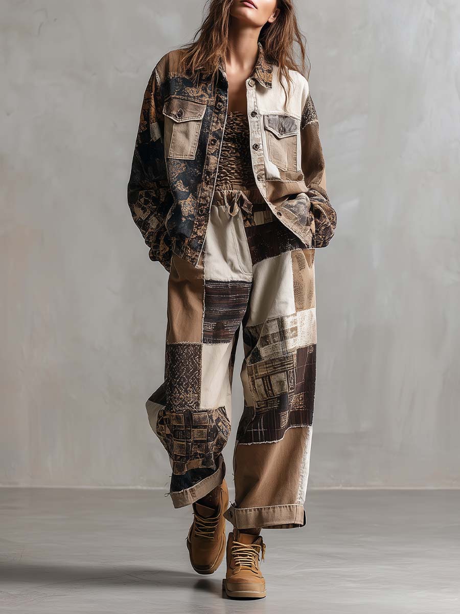 Make a bold statement with this patchwork printed utility set, featuring a relaxed-fit jacket and wide-leg pants. Crafted from mixed-pattern panels in earthy tones, the design blends rugged workwear elements with artistic flair. The jacket offers chest flap pockets and a button front, while the matching pants come with an elastic drawstring waist for effortless comfort. Perfect for turning everyday outings into style moments.