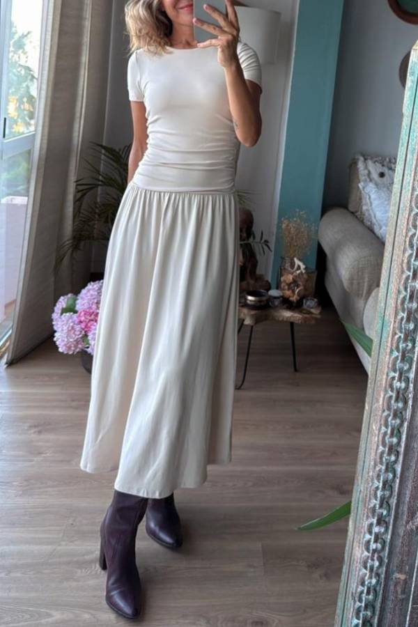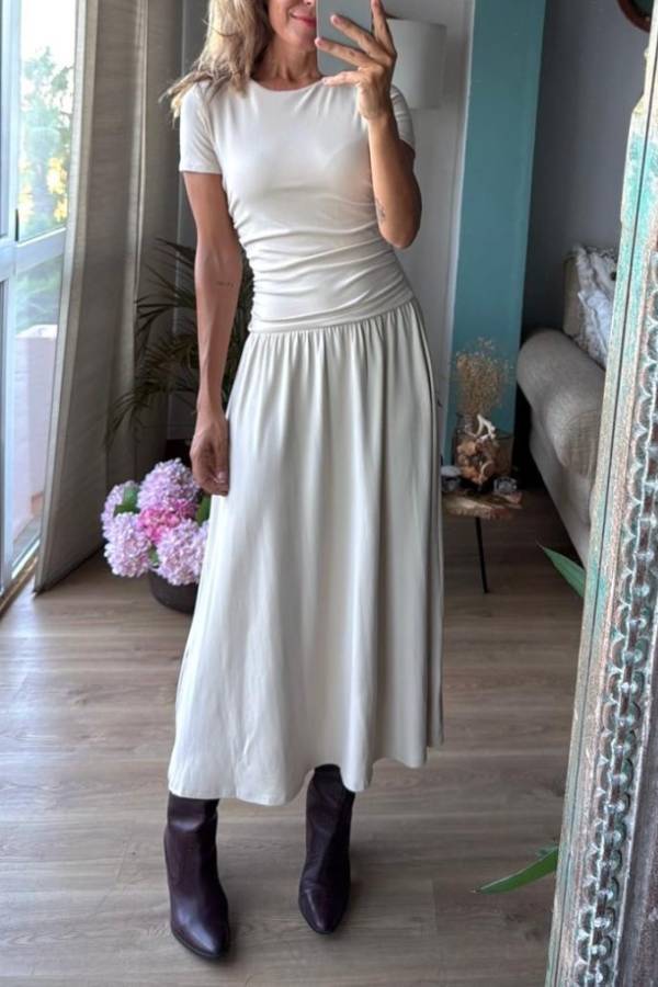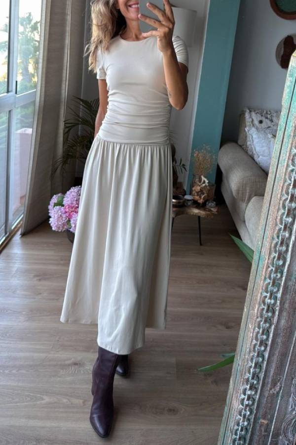 Long stretch dress with short sleeves, cut at the waist and side gathers