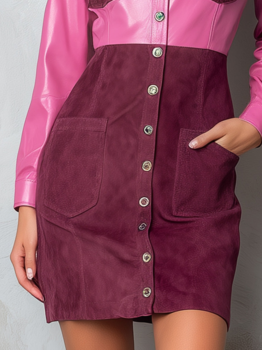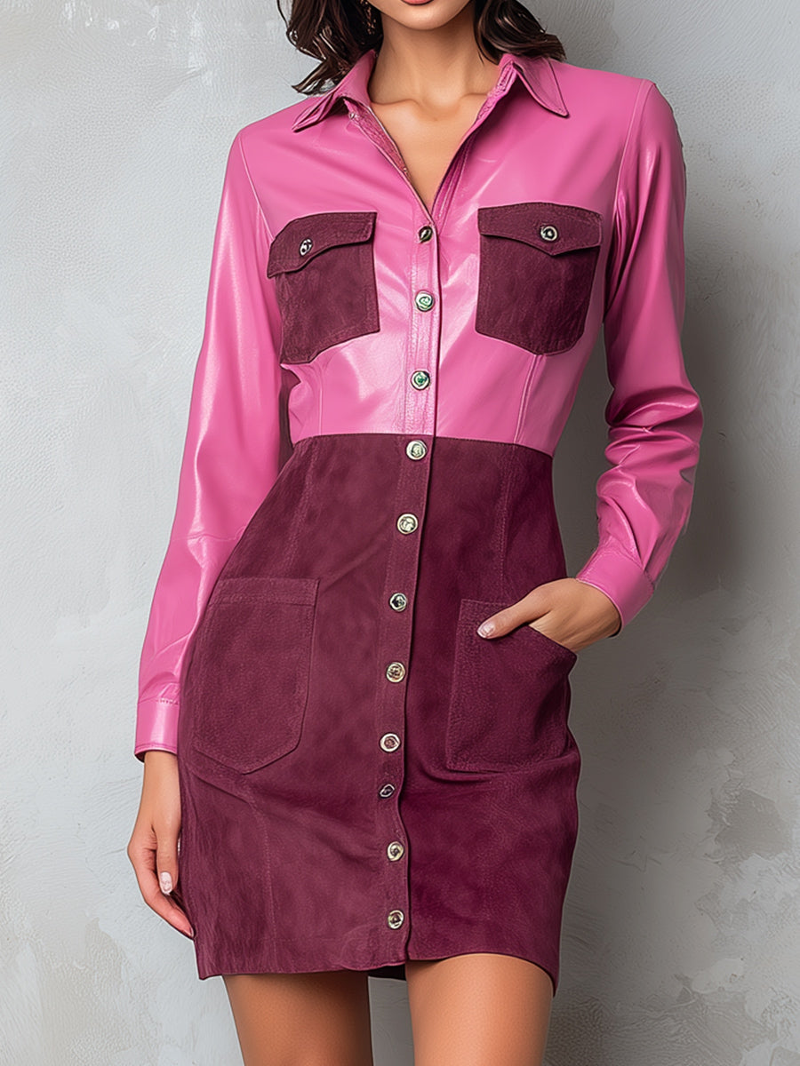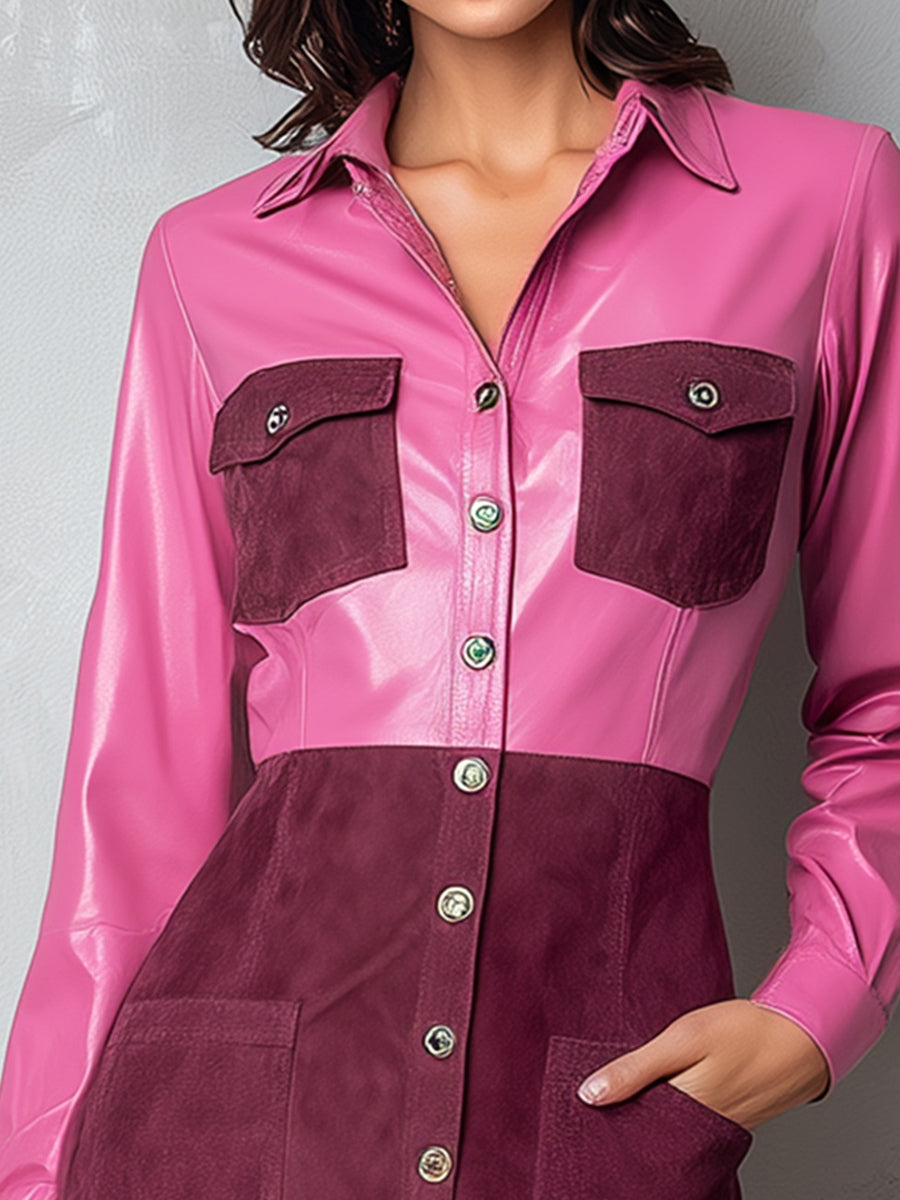 Pink And Burgundy Colorblock Eco Leather & Suede Shirt Dress