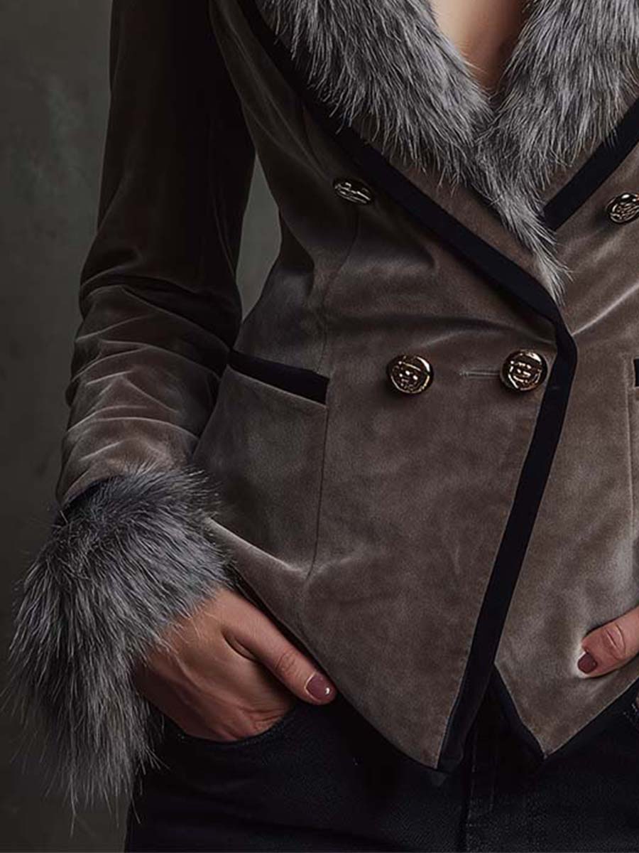 Polyester Velvet Double-Breasted Blazer With Faux Fur Collar & Cuffs
