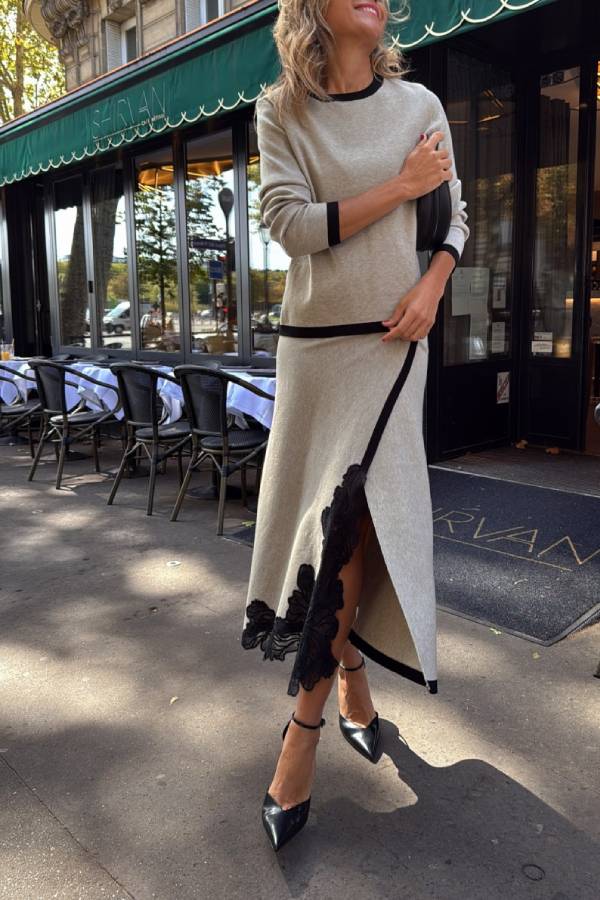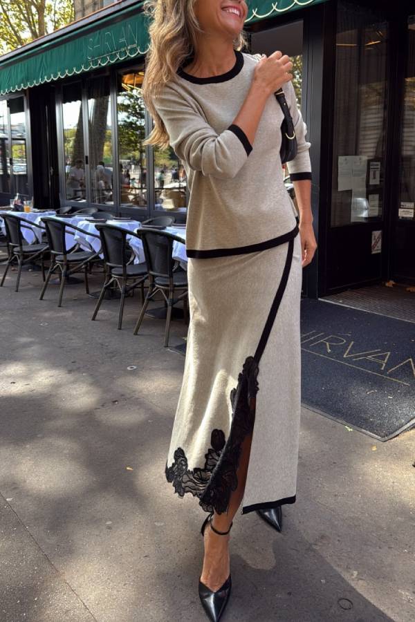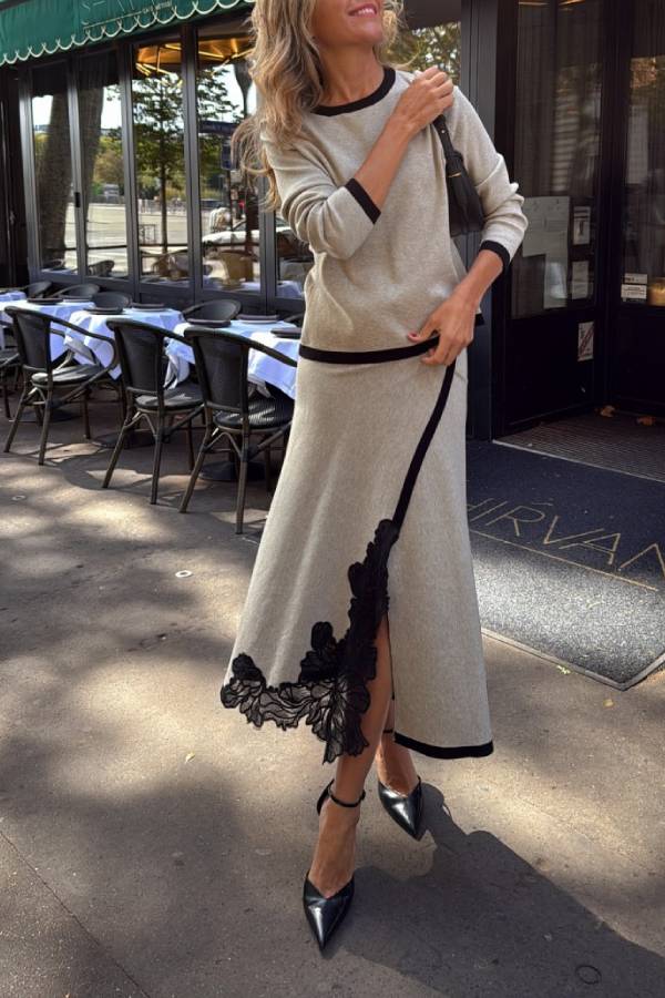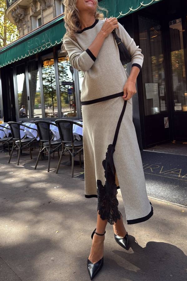 A knitted two-piece suit with a round neck and contrasting color design on the top and a skirt with lace embroidery and contrasting color edging. It is elegant and exquisite, suitable for commuting, light socializing and other occasions.