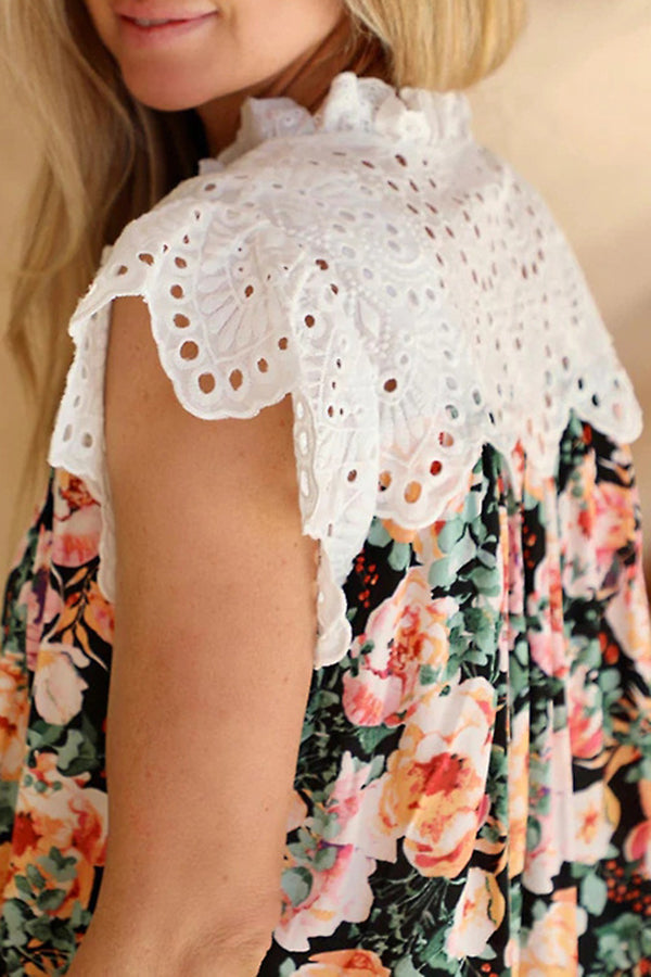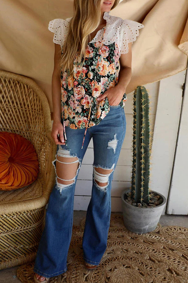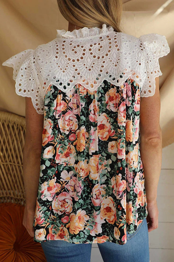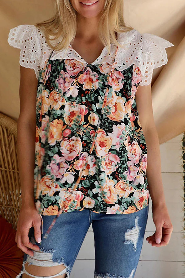 Printed V-Neck Sleeveless Lace Panel Casual T-Shirt