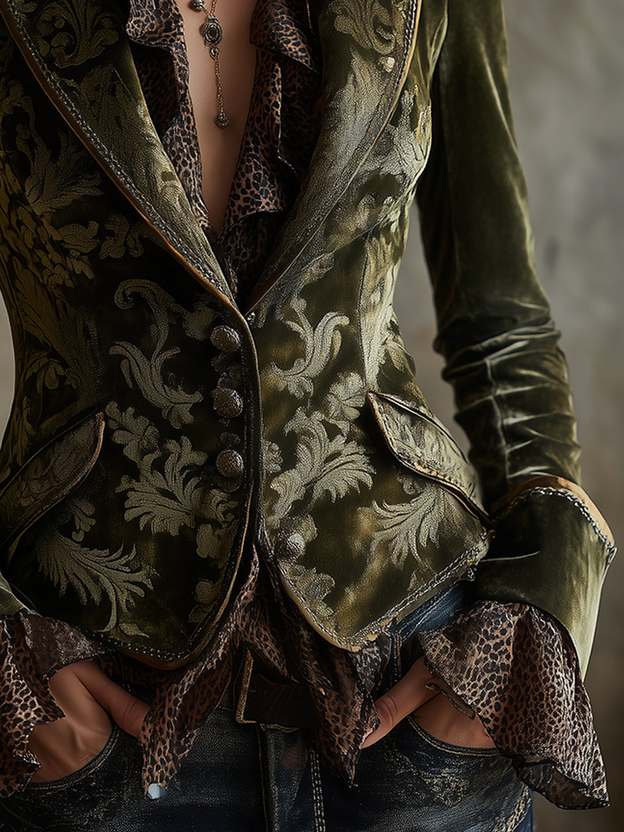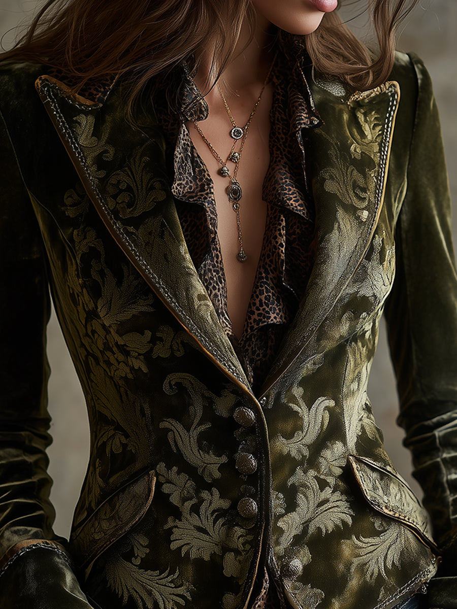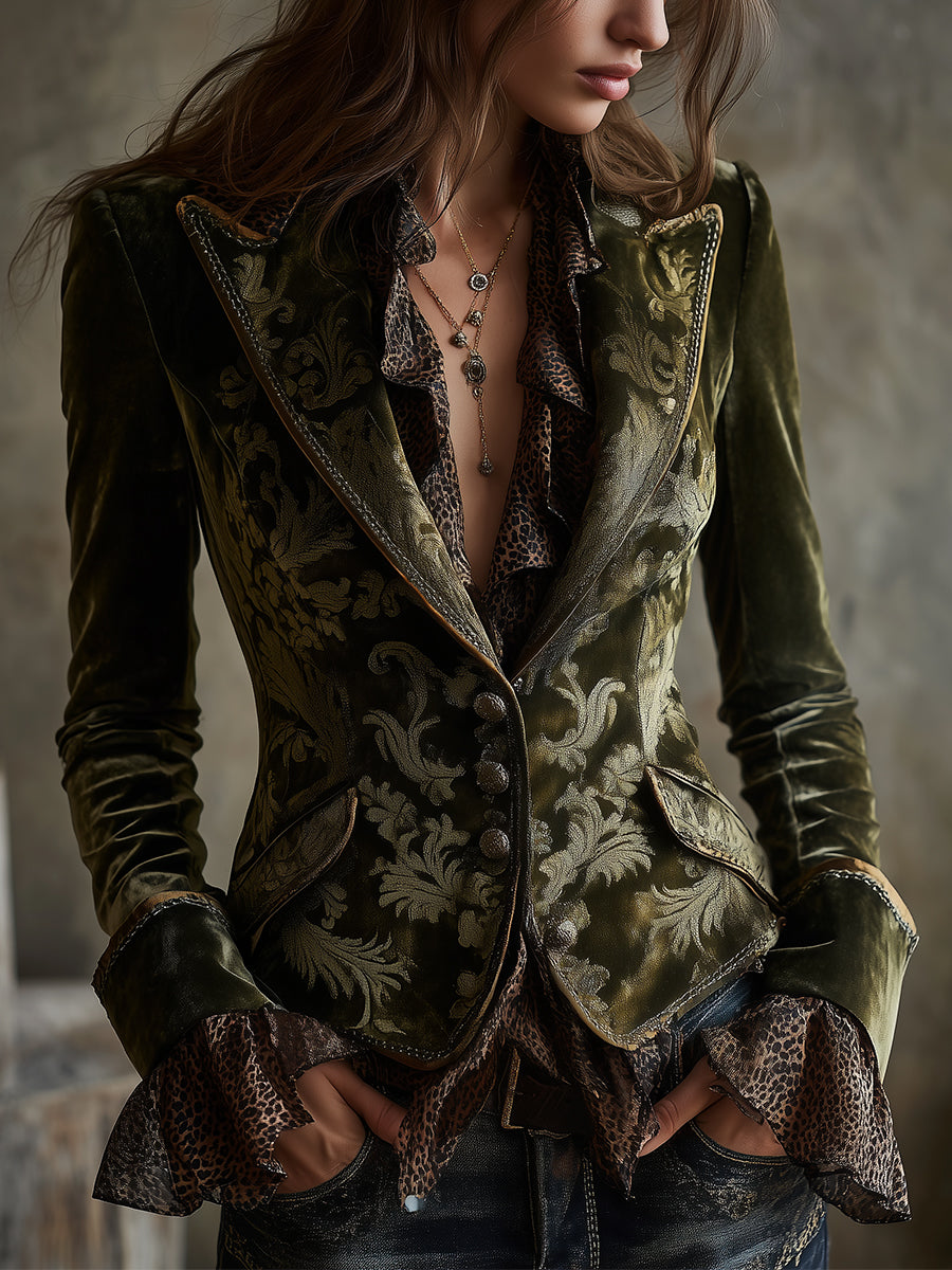 Quiet Luxury Retro Baroque Pattern Polyester Velvet Blazer