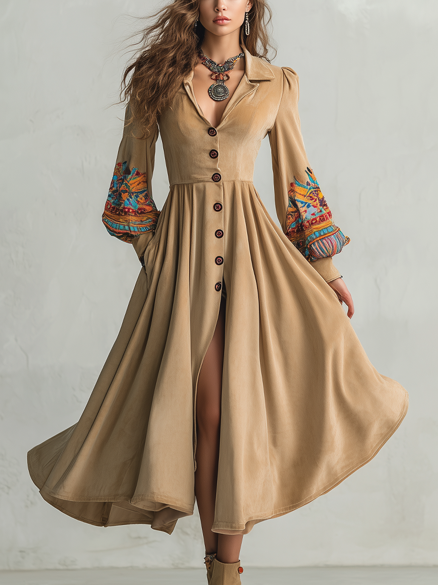 - Bohemian Design: The dress flaunts a retro bohemian style, characterized by its colorful cuffs and rich velvet texture.