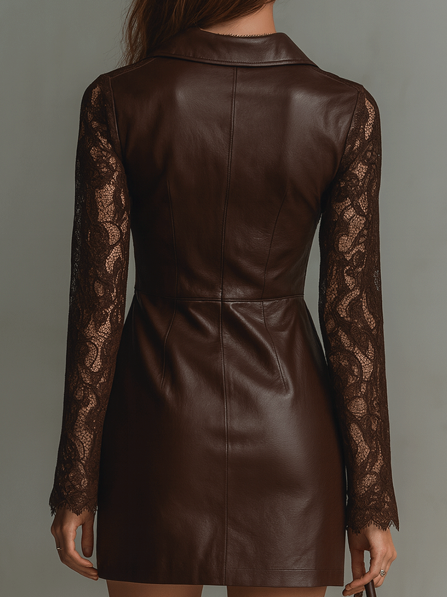 Retro Brown Leather & Lace Zip-Up Mini Dress