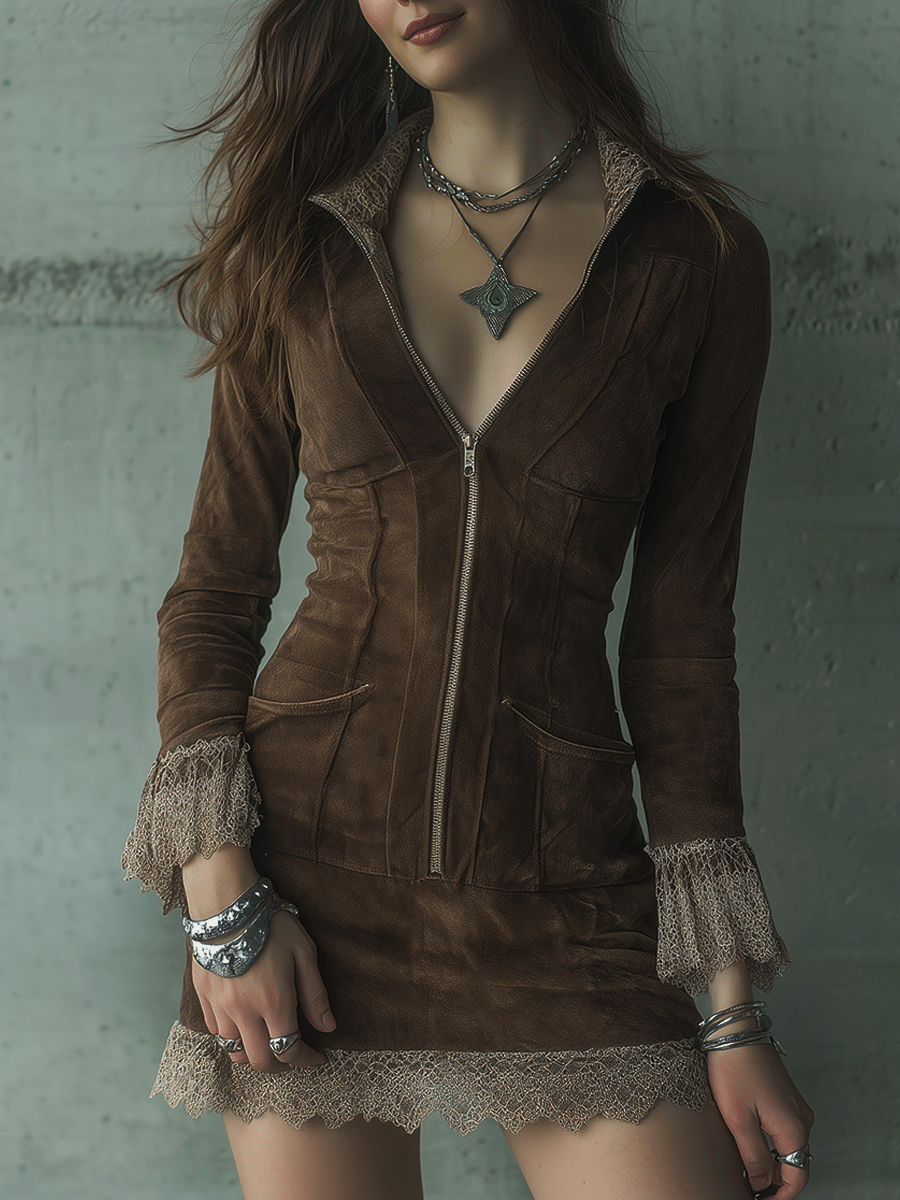 Retro Brown Suedewith Lace Trim And Zip Front Mini Dress