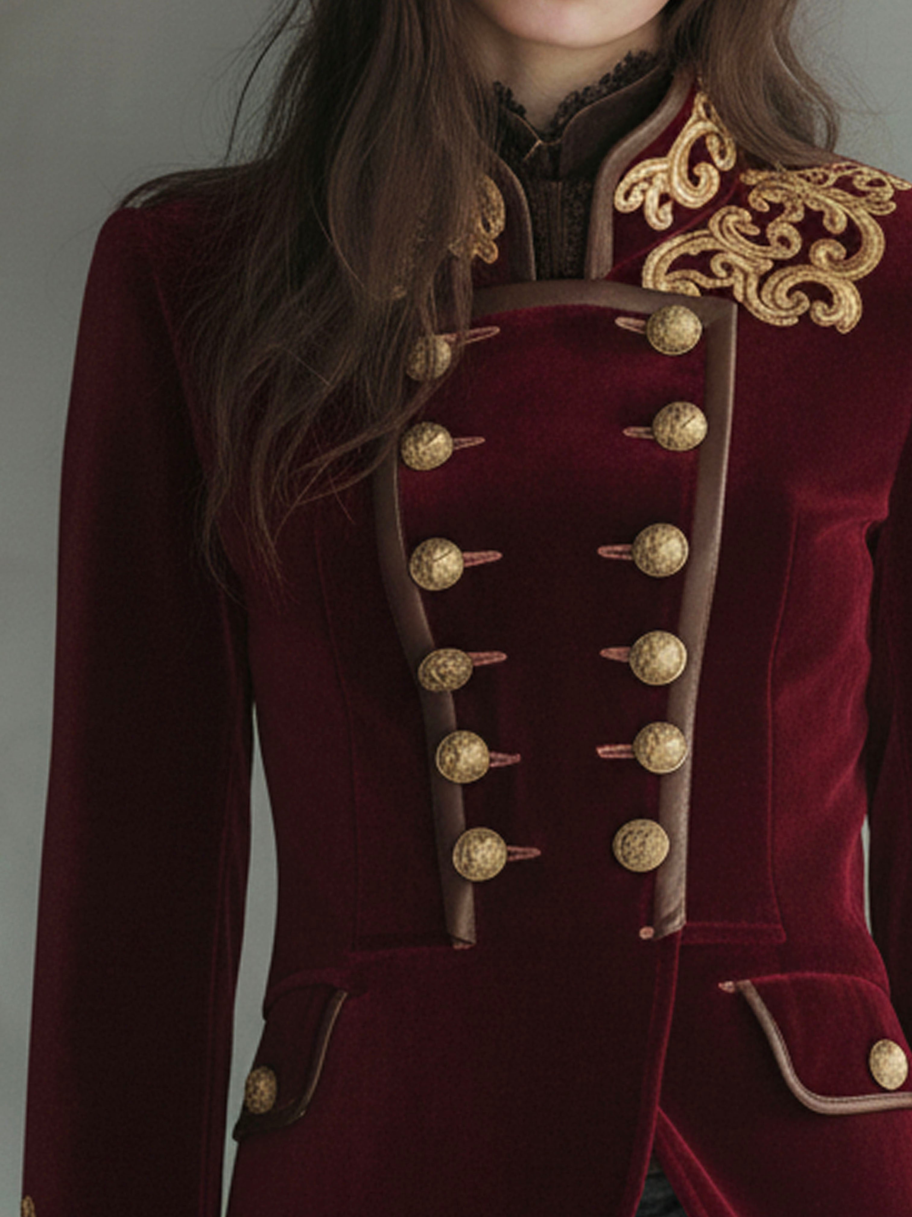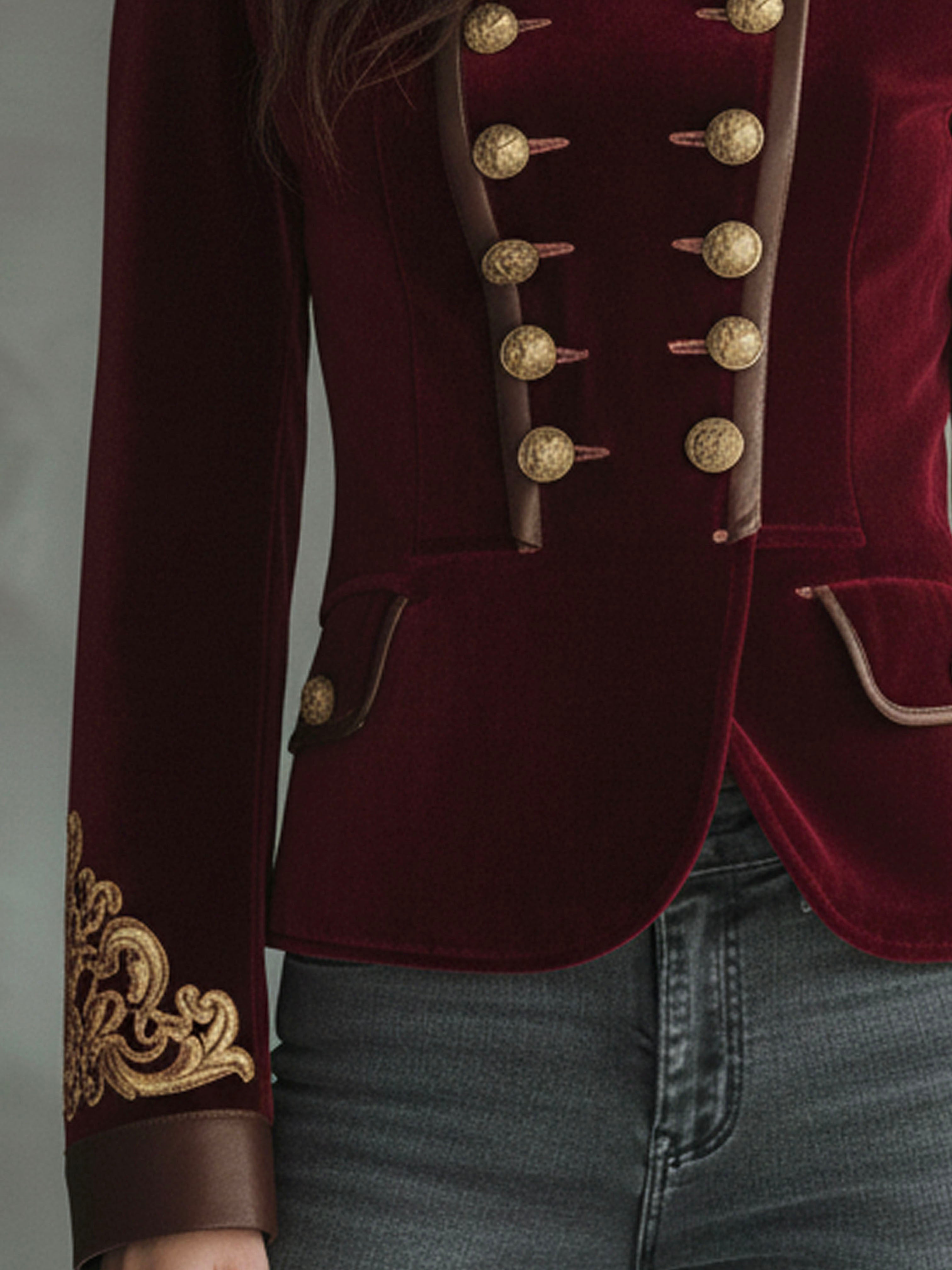 The Retro Burgundy Double-Breasted Embroidered Military Blazer with Brown Trim is a standout garment that combines historical elegance with modern style. Whether you're attending a formal event or a stylish gathering, this blazer is sure to make a profound impact. Its luxurious feel and intricate detailing ensure that you will be the center of attention wherever you go.