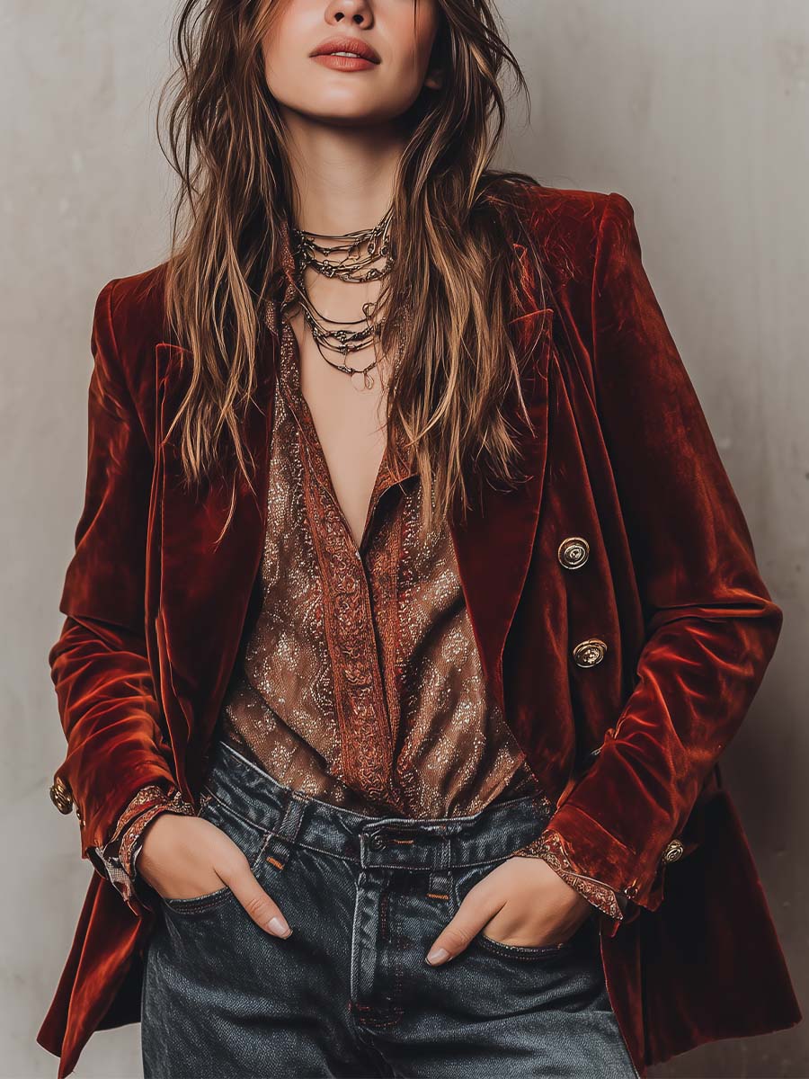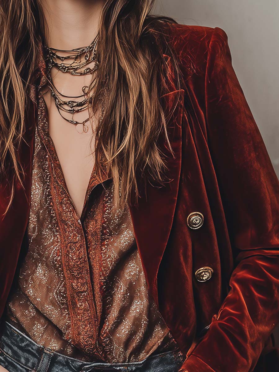 Embrace elegance with the Retro Burnt Red Velvet Fitted Blazer – a versatile piece that can transition effortlessly from office wear to evening outings. Its unique color and classic design make it a must-have for those who appreciate both style and substance.