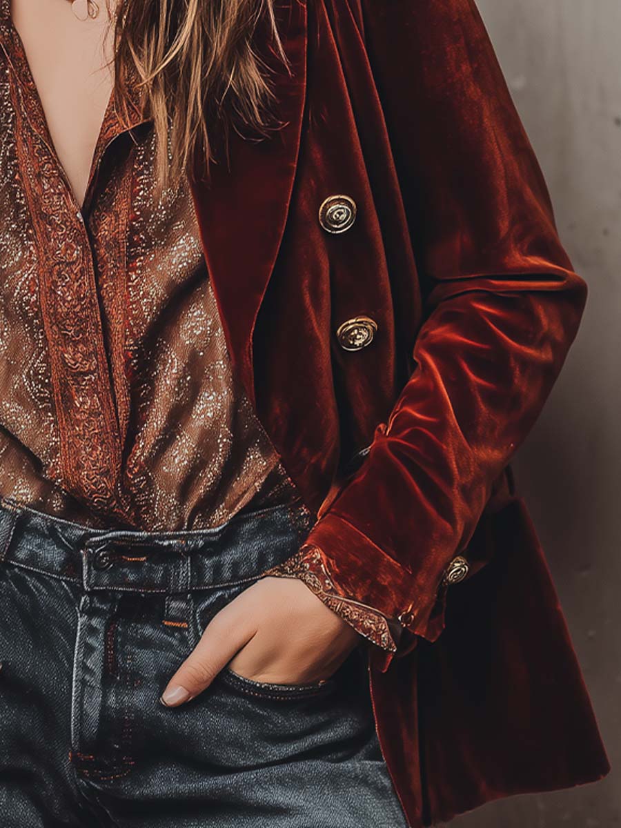 Retro Burnt Red Velvet Fitted Blazer