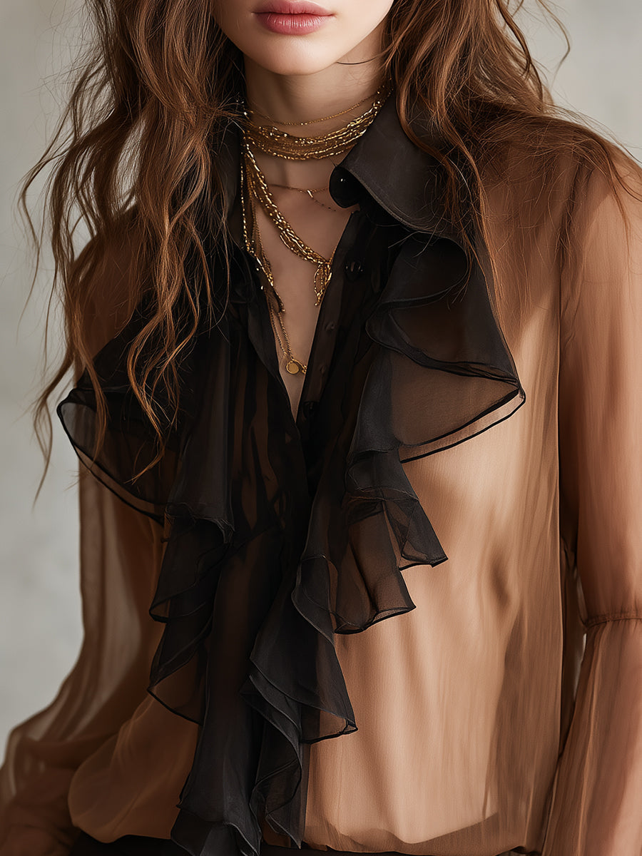 Retro Contrasting Double Layer Chiffon Ruffle Bell Sleeves Blouse