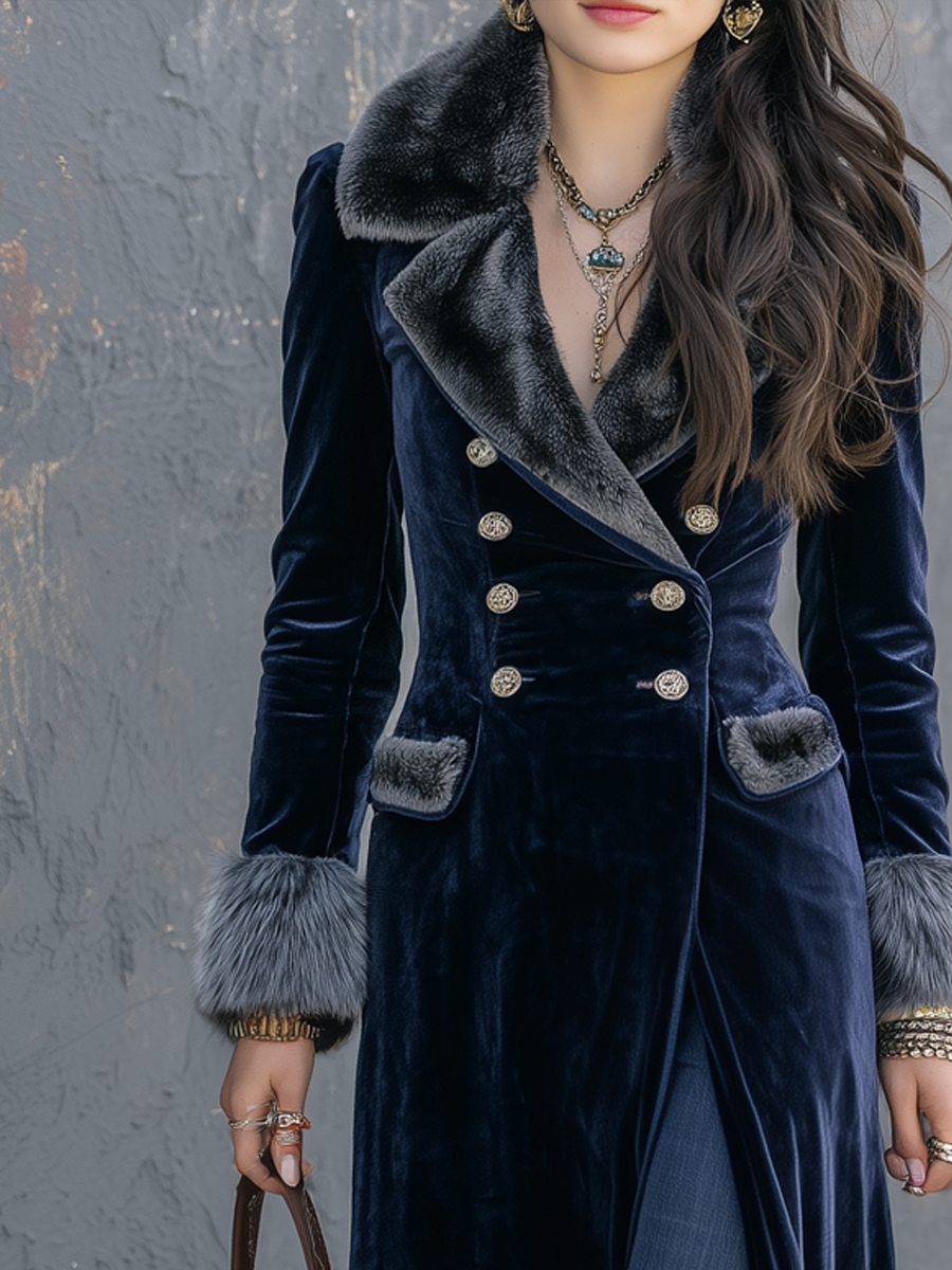 The Retro Eco-friendly Fur Collar Velvet Coat is an exceptional piece for those who appreciate vintage charm coupled with modern sustainability. With its elegant details and eco-conscious construction, it is an indispensable addition to your autumn and winter wardrobe.