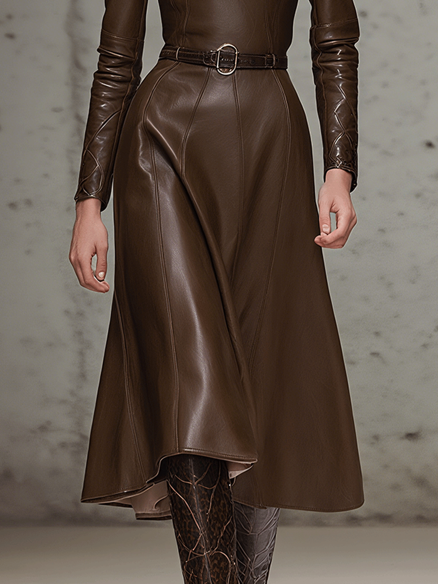 Retro Fashion Chocolate Faux Leather A-Line Midi Dress (With Belt)
