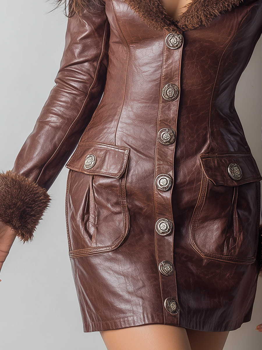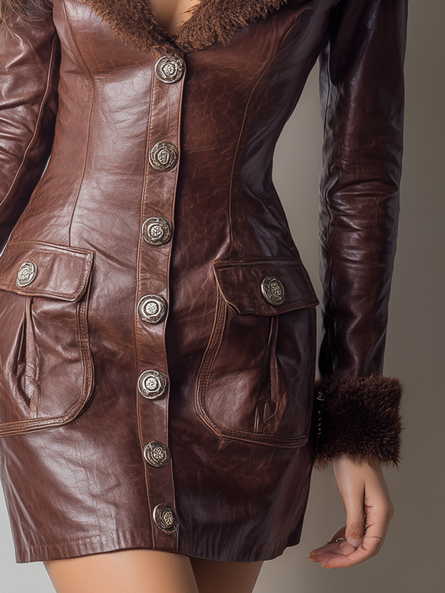 Retro Faux Fur Collar Eco-leather Mini Dress