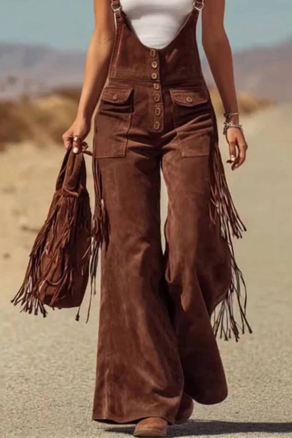 A vintage-inspired pair of faux suede overalls featuring a fitted bodice, button details, and wide flared legs. Finished with fringe accents for a bold Western touch.