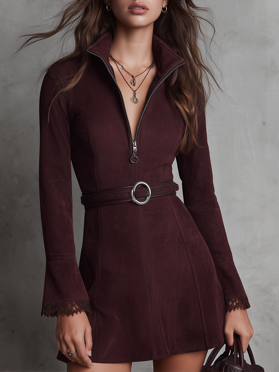 Retro Front Zipper Lace Splicing Suede Mini Dress With Belt