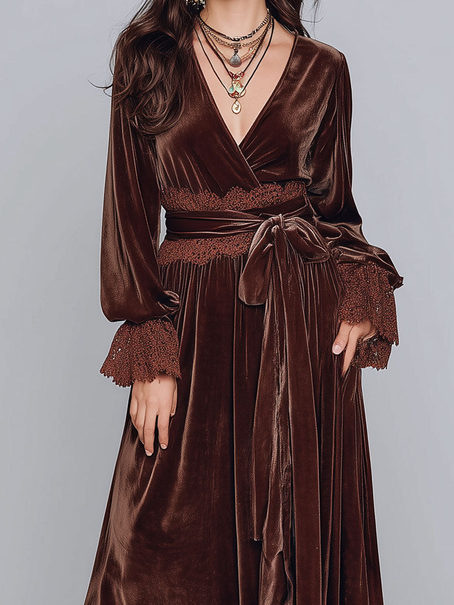 The Retro Gold Velvet Lace Splicing Maxi Dress with Belt is a timeless piece that effortlessly combines vintage charm with modern elegance. This exquisite dress is crafted from luxurious gold velvet fabric which gives it a sumptuous and rich finish, perfect for creating a standout look. The lace splicing adds a delicate, feminine touch, enhancing the vintage appeal of the dress.