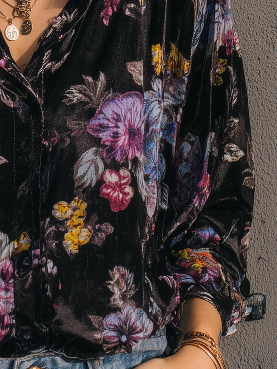 Retro Gold Velvet Printed Long Sleeve Blouse