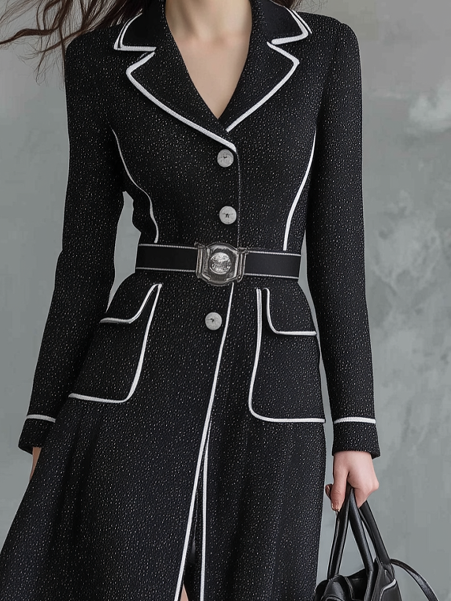 This Retro Lapel Contrast Trim Knitted Midi Dress is a chic and versatile addition to any wardrobe. With its classic design and contrasting trim, this dress combines comfort with timeless style, making it ideal for various occasions.