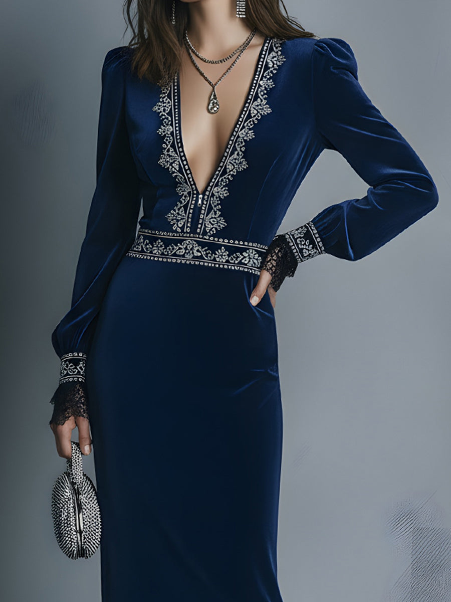 The Retro Midnight Velvet Grace Midi Dress is an elegant piece that embodies timeless charm and sophistication. Its rich midnight blue hue and luxurious velvet texture make it a standout option for evening wear.