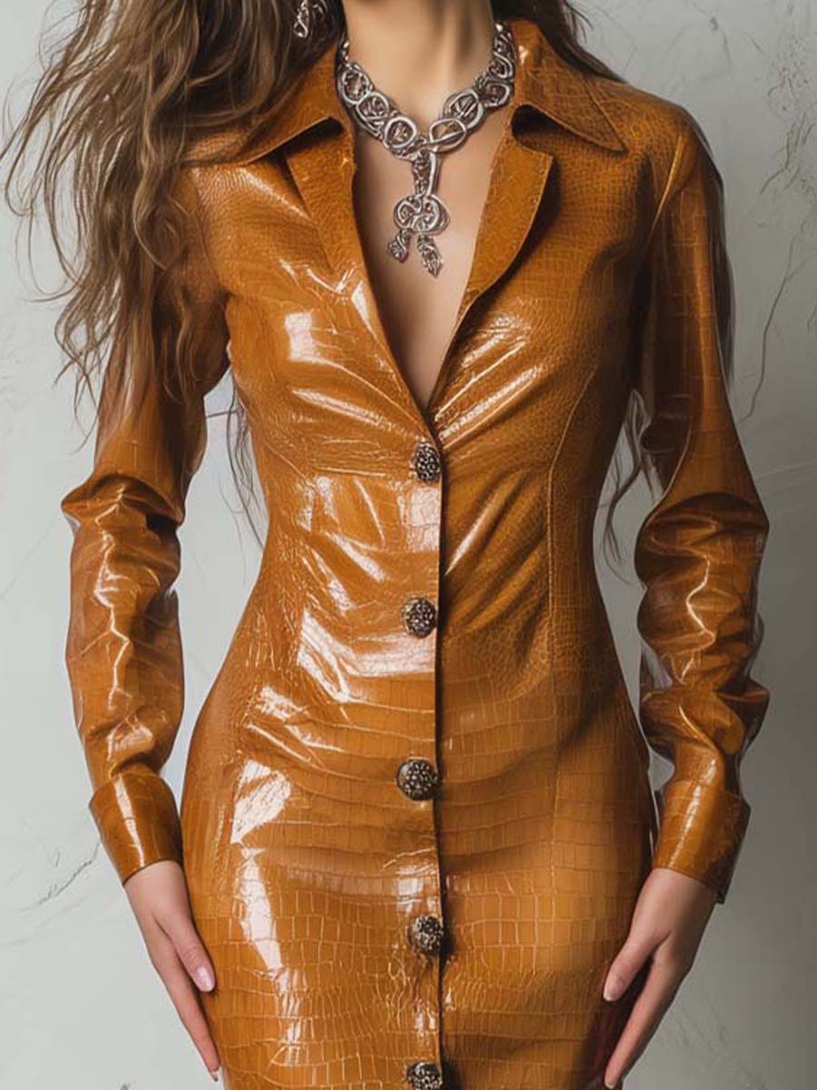 Retro Modern Caramel Eco-Croco Embossed Leather Shirt Dress