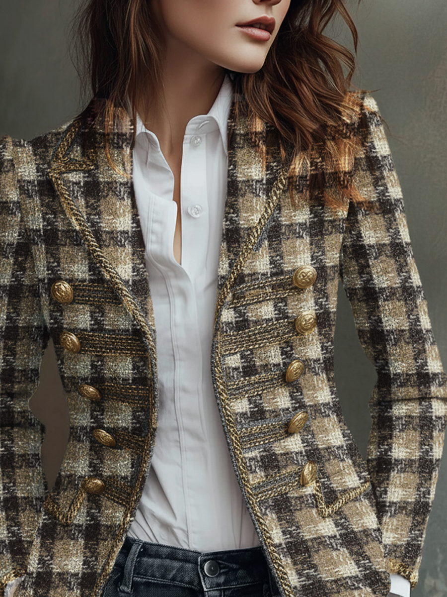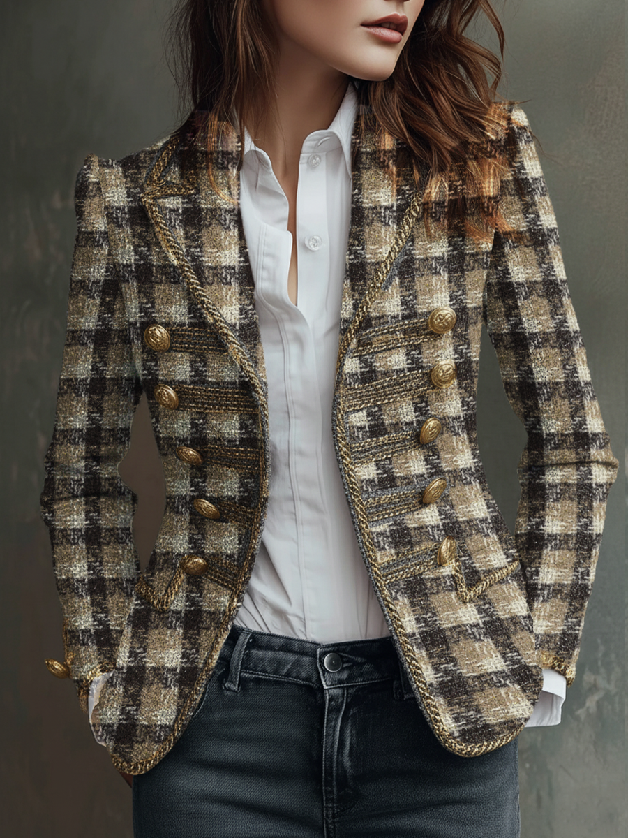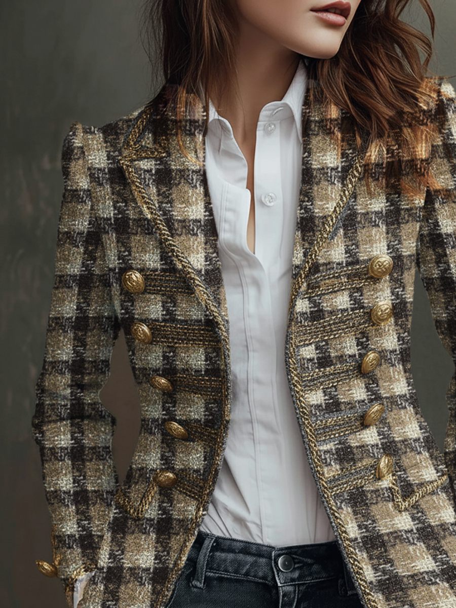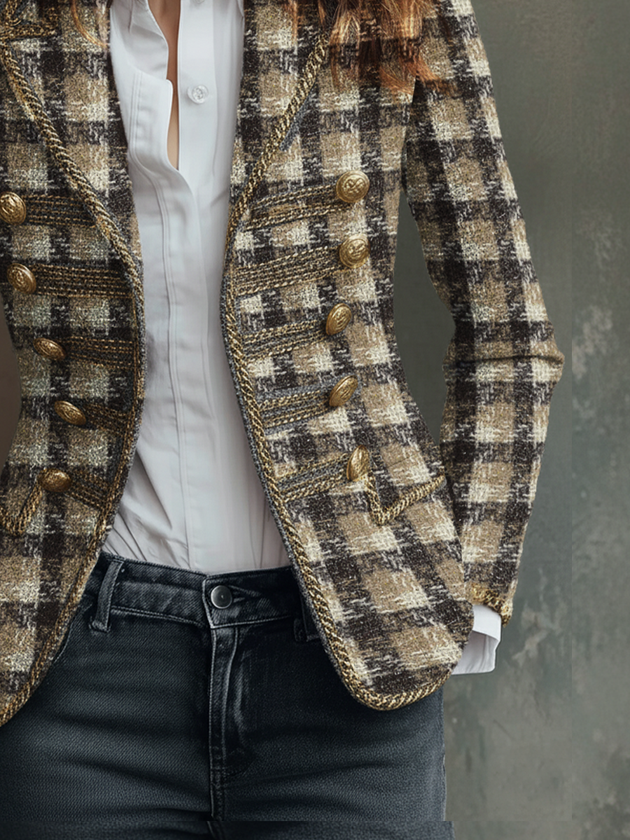Retro Plaid Tweed Military Style Blazer